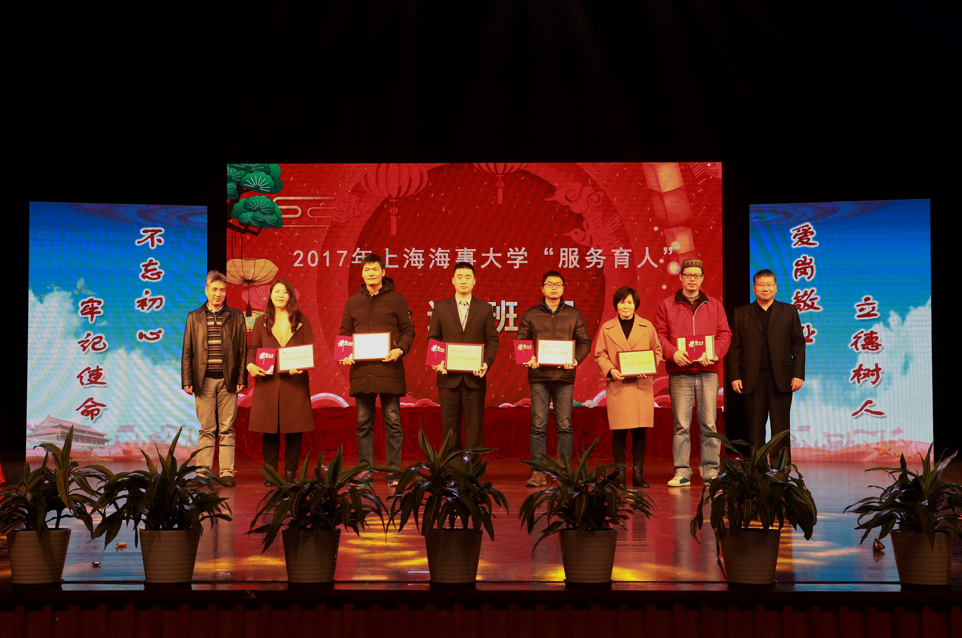 王海威副书记为上海生乐物业管理有限公司环境保洁服务组、上海家佳物业管理有限公司学生公寓服务组等6个“服务育人”先进班组,保安队长周建东、学生公寓宿管员张兰文等10名“服务育人”先进标兵,陈平、康明等24名先进标兵提名奖获得者分别颁发了奖牌、奖杯和荣誉证书,并对获奖的先进班组和标兵表示祝贺。