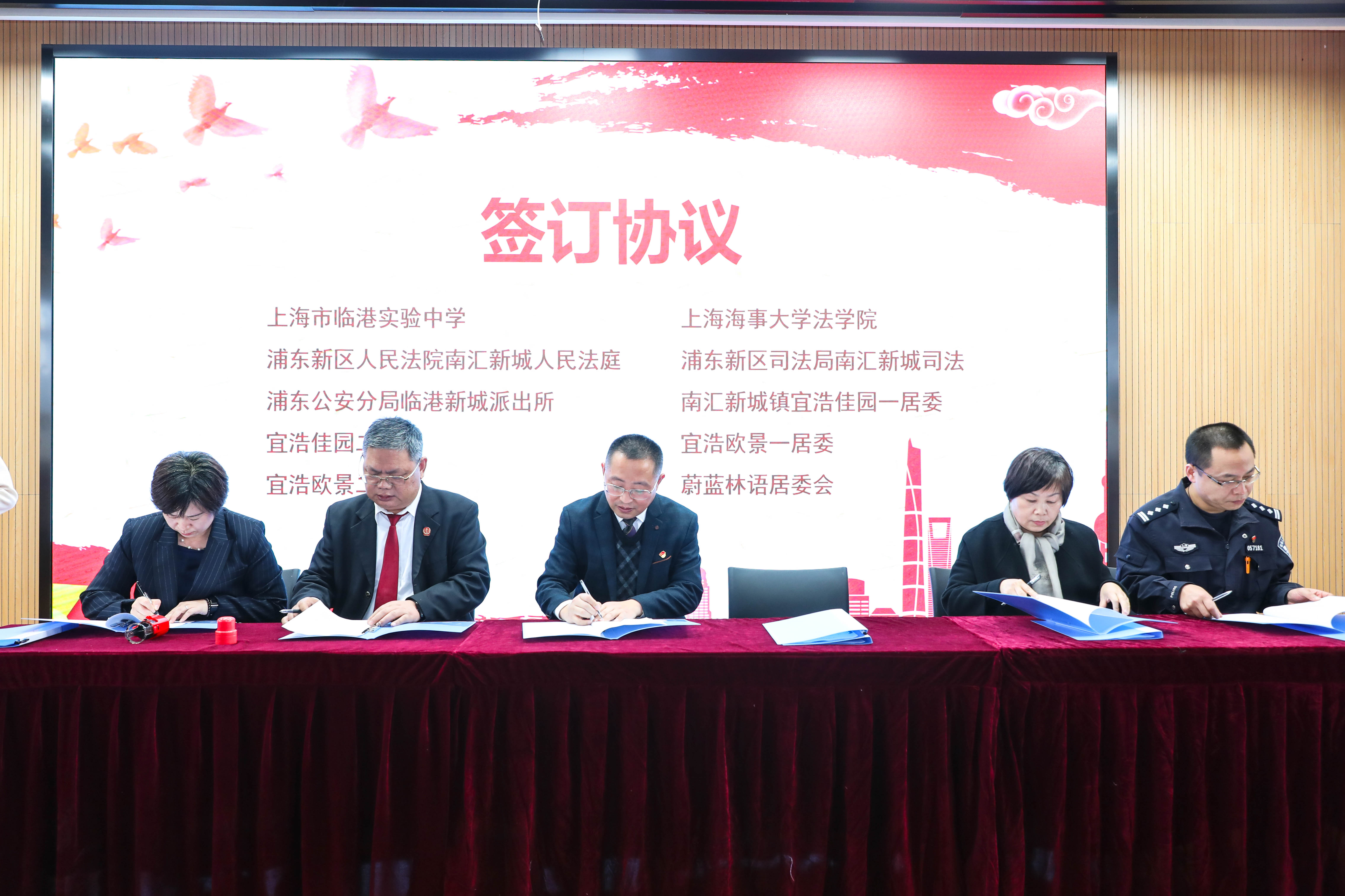 启动仪式上,上海海事大学法学院党委书记李希平代表学校与上海市临港实验中学、南汇新城司法所、南汇新城人民法庭、临港新城派出所、南汇新城镇申港社区各居委等10家单位代表共同签署了共建协议。