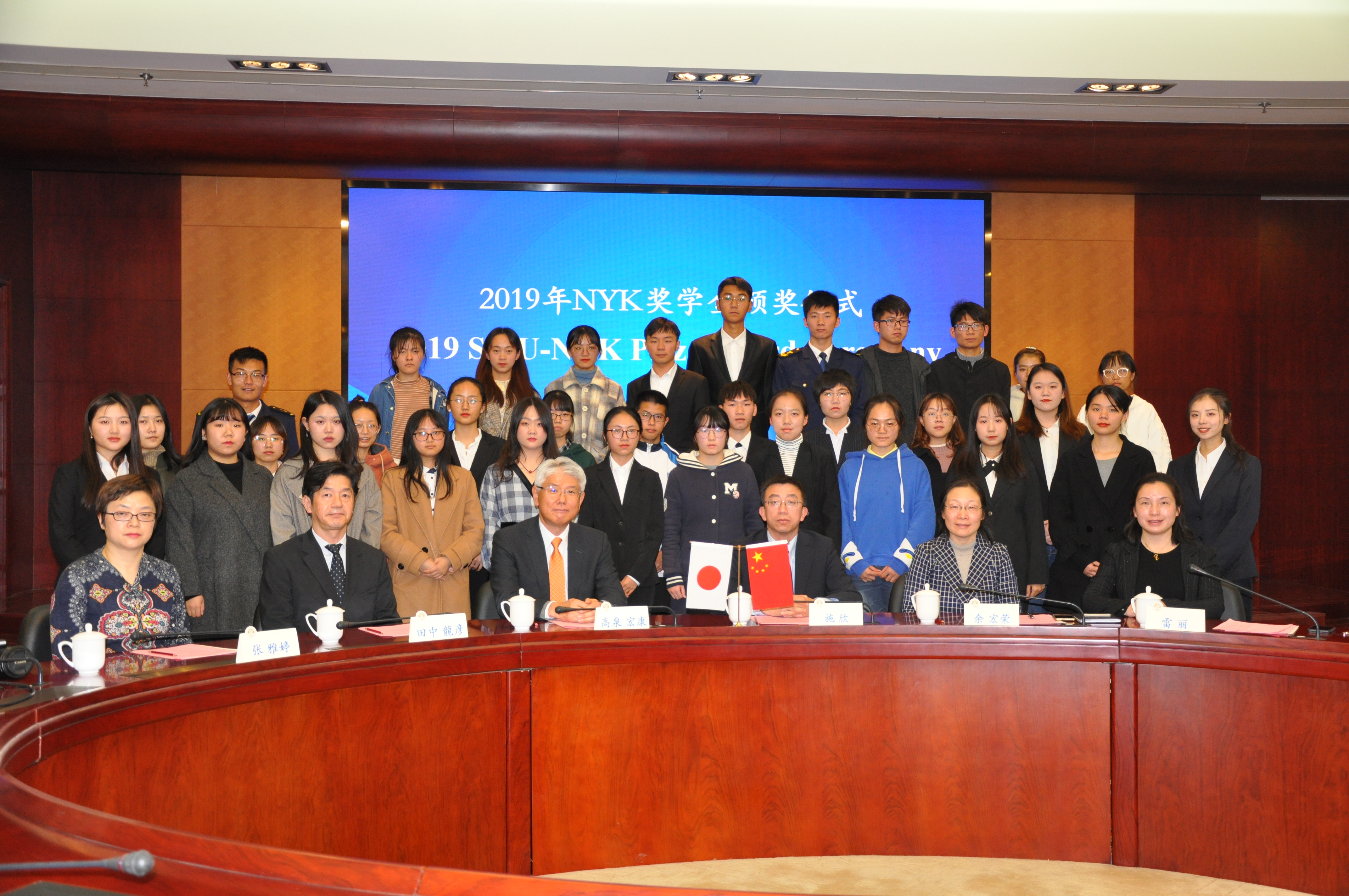 11月28日,2019年度日本邮船株式会社(NYK)奖学金助学金颁奖典礼在上海海事大学举行。日本邮船中国总代表高泉宏康,日本邮船东亚区管理办公室副总经理田中龍彦、经理张雅婷,上海海事大学副校长施欣、以及国际交流处、学生处负责人等出席了仪式。