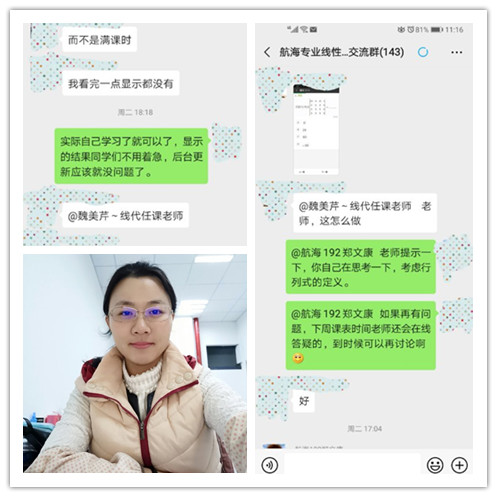 文理学院数学教研室线性代数课程组的11位教师(包括8位女教师),在组长魏美芹老师的带领下,短时间内从源课程的选定,课程学习页的操作熟悉,到课程的最终发布以及学生名单的有序导入等进行精准实施,让全校2000多名选课学生顺利开启了新学期的学习。作为课程负责人,魏美芹老师短时间内找到课堂效果最优的“组合模式”,在微信群视频分享操作的方式、在线技术指导及答疑解惑。在数学学科里和魏美芹老师一样的还有很多,如数学实验教学团队课程负责人李青老师、王彩芳老师、杨恒云老师……正因为有这样一群最可爱的人,数学学科最终顺利通过这次特殊的在线教学“大考“。