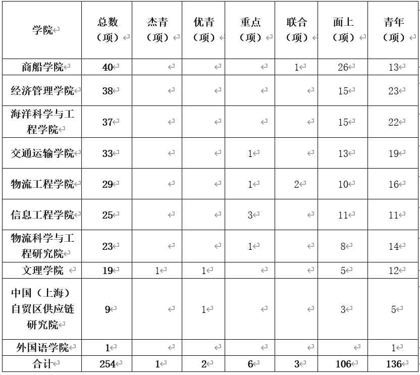 日前,上海海事大学圆满完成2020年度国家自然科学基金项目集中申报工作,全校10个部门共申请254项国家自然科学基金项目。其中包括1项国家杰出青年科学基金项目,2项优秀青年科学基金项目,6项重点项目,3项联合基金项目,106项面上项目,136项青年科学基金项目。高层次项目申报数比上年增长50%。