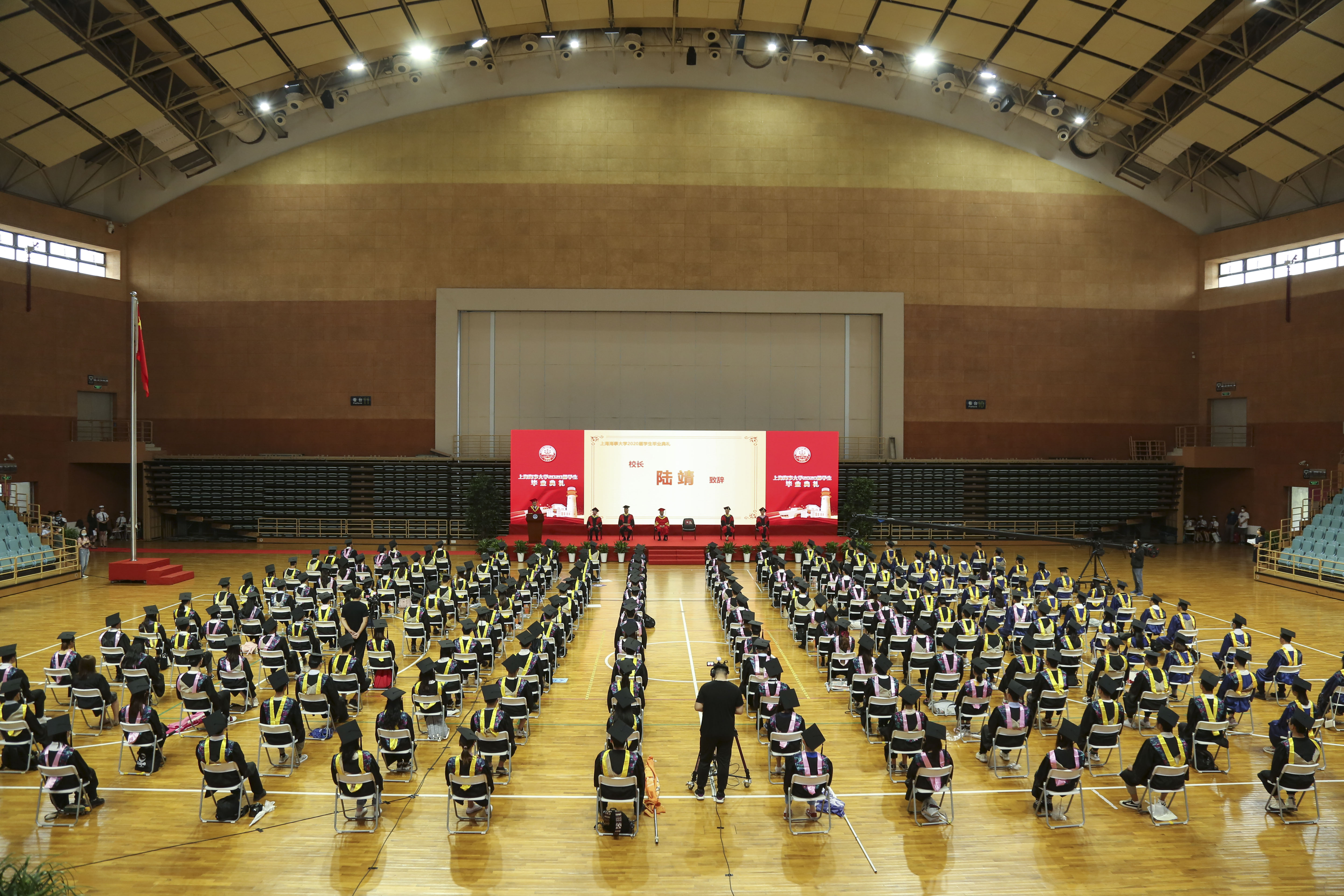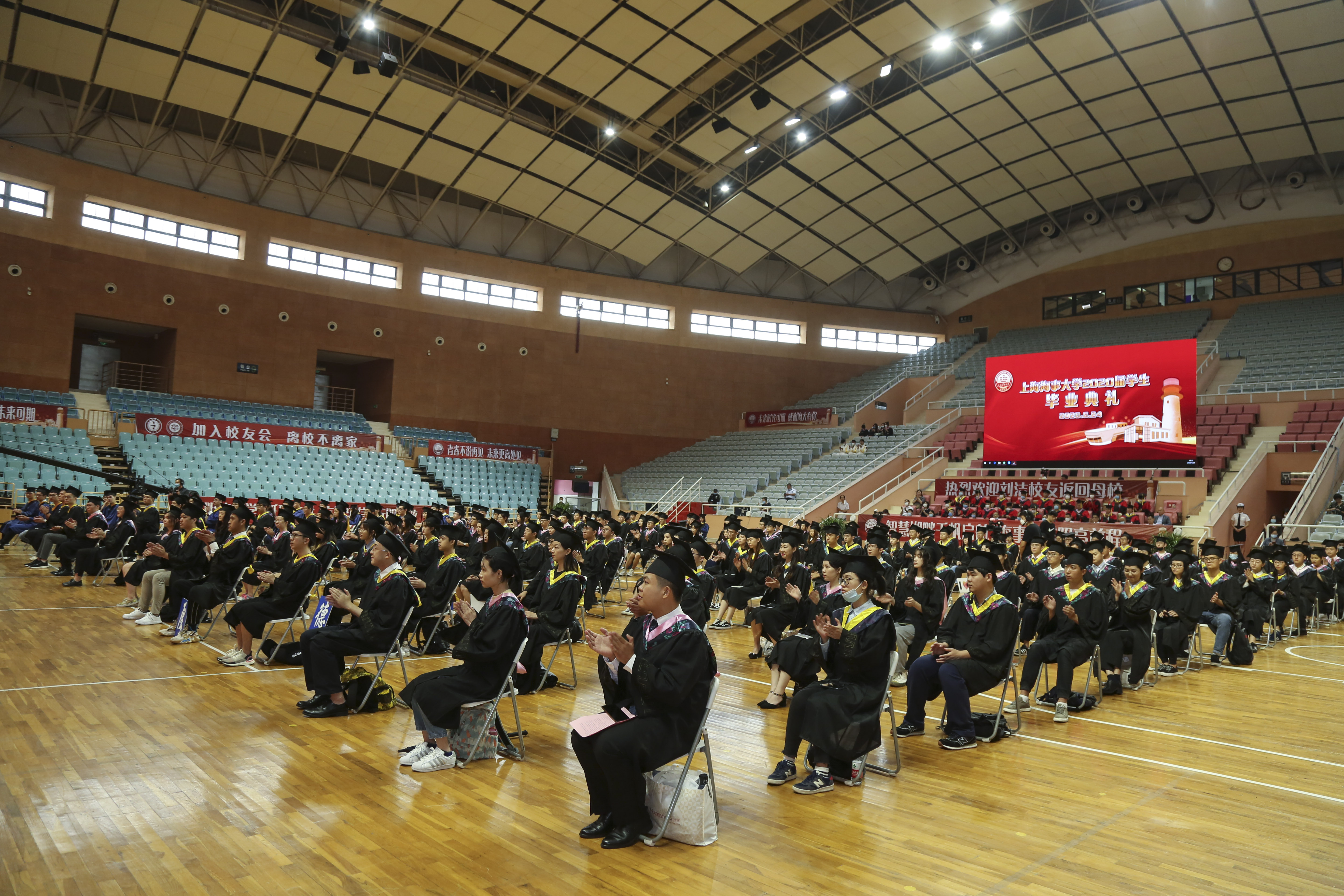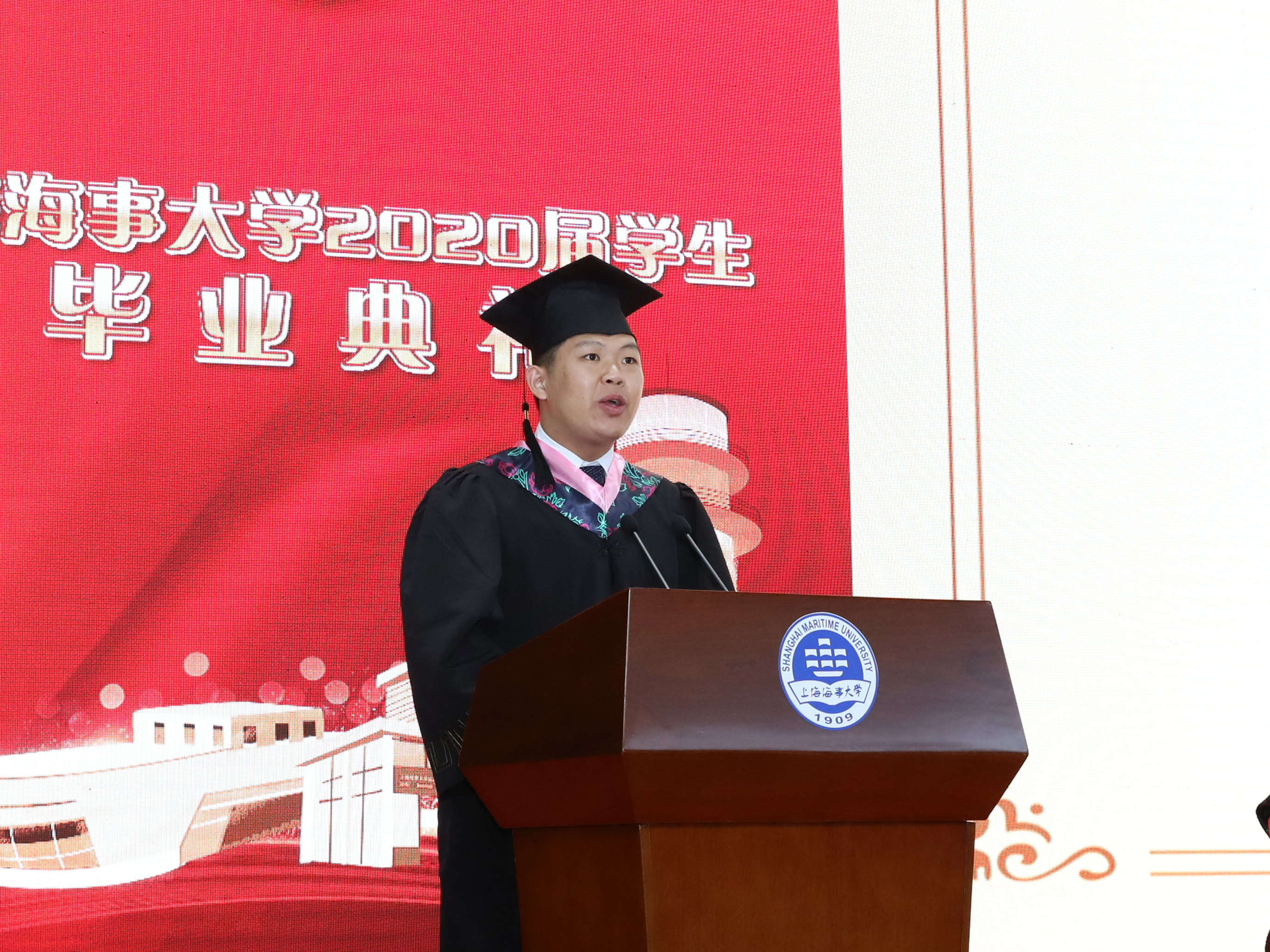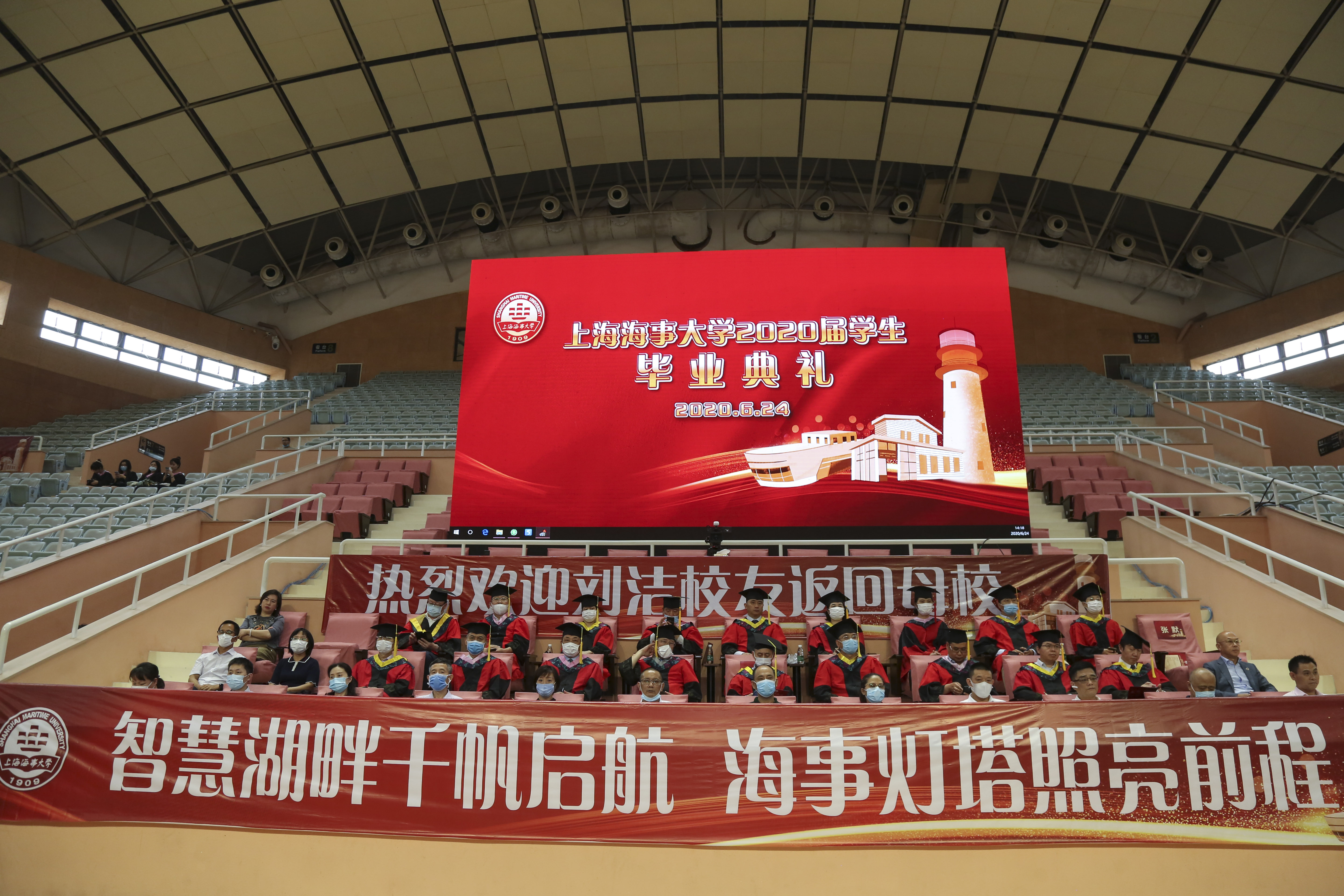 6月24日下午,上海海事大学举行2020届学生毕业典礼,校领导宋宝儒、陆靖、杨万枫、门妍萍、贺莉、施欣,各学院党政负责人、教师代表及毕业班辅导员、毕业生代表、家长代表、校友代表共200余人出席了在校体育馆举行的现场典礼。身处祖国各地的5300多名毕业生相聚“云端”,通过线上直播,共同见证这一难忘时刻。施欣副校长主持毕业典礼。