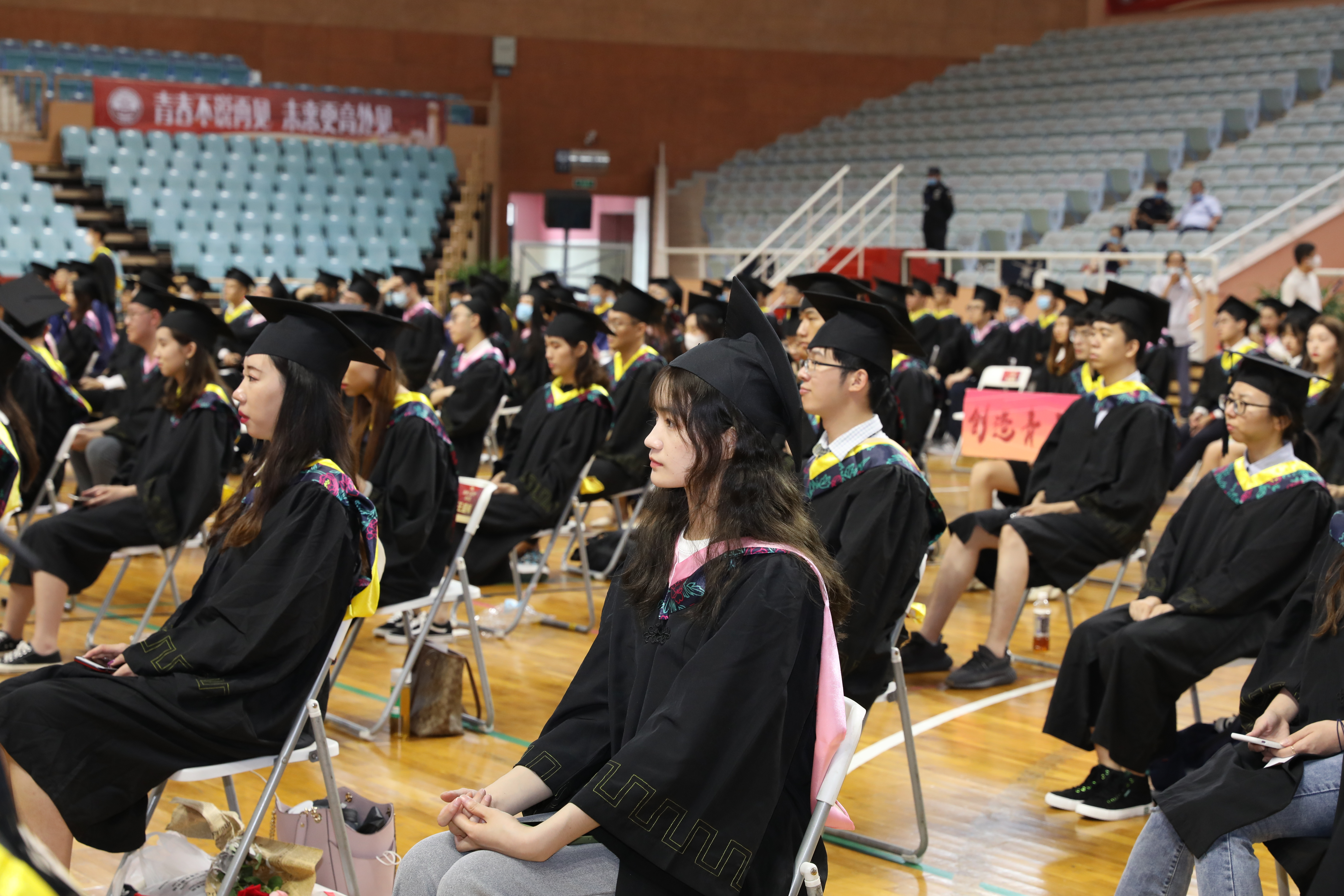 在毕业典礼现场,优秀毕业生代表依次走上主席台,接受校领导颁发的毕业证书、学位证书,接受“拨穗礼”。