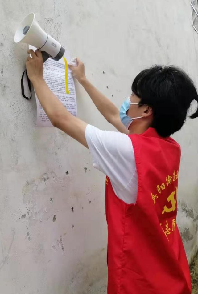 电控荷191班学生黄宇腾报名加入社区暑期疫情防控志愿者队伍,前往河南省驻马店市正阳县东花园社区进行卡点站岗工作,他挨家挨户走访调查、宣传防控政策,并在每个街口张贴疫情防控工作公告,加强疫情防控巡逻。