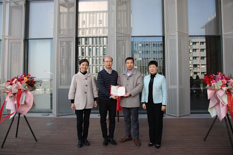 李志鹏为俞鸿斌颁发企业家辅导员项目“特别贡献奖”,并和嘉宾一同为学校“企业家辅导员”校外工作室揭牌。