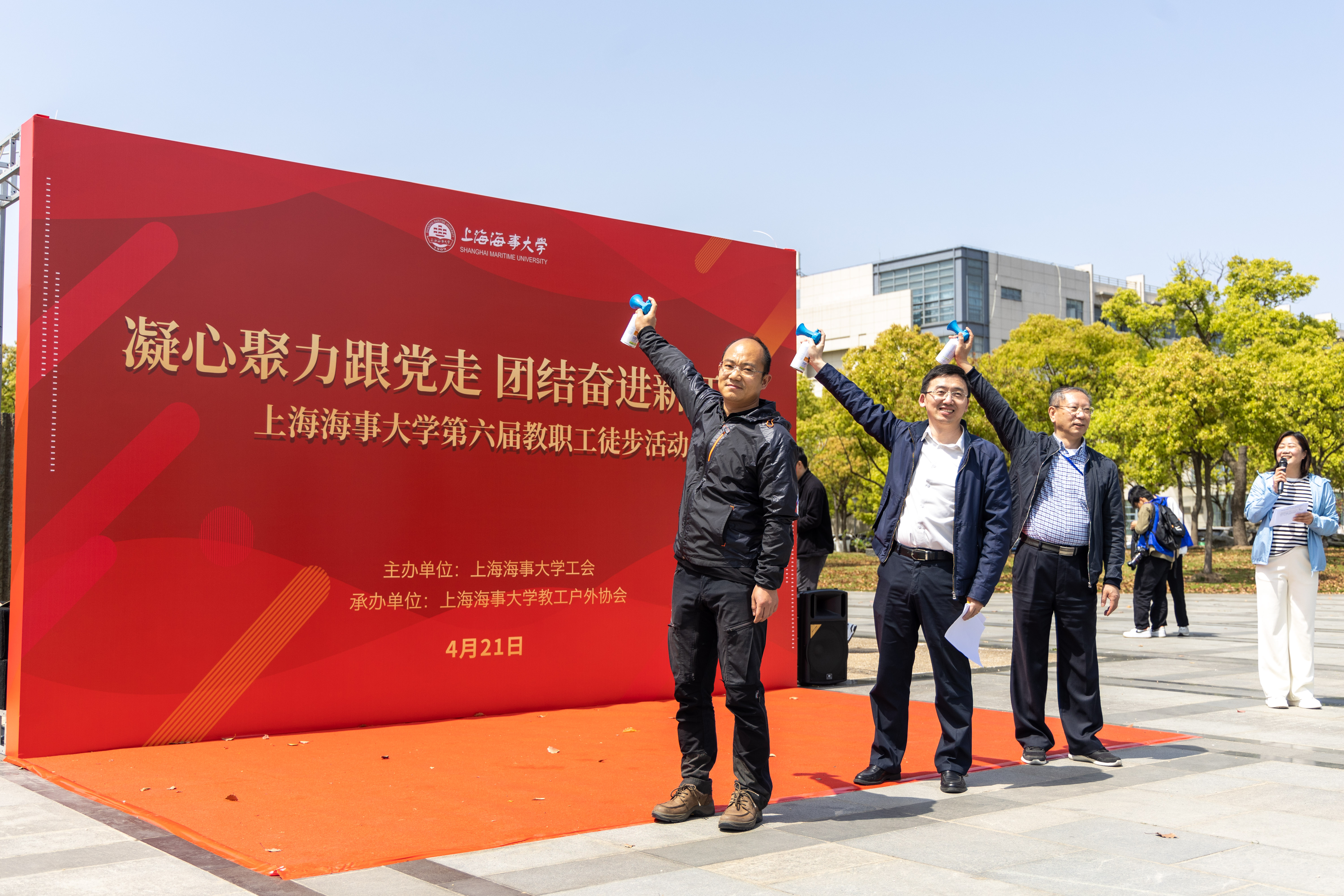 学校党委常委、宣传部部长殷明,工会常务副主席李序颖,教工户外协会会长石立山老师共同为活动鸣笛,正式拉开了本次徒步活动的序幕。