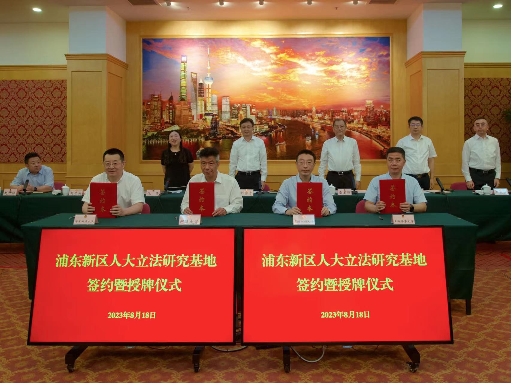 仪式上,区人大法制委常务副主任委员、法工委主任赵开银介绍了浦东新区人大立法工作有关情况;区人大常委会党组成员、办公室主任刘世洪与3所高校法学院领导签订共建协议;刘宇青分别与3所高校领导为“立法研究基地”揭牌。
