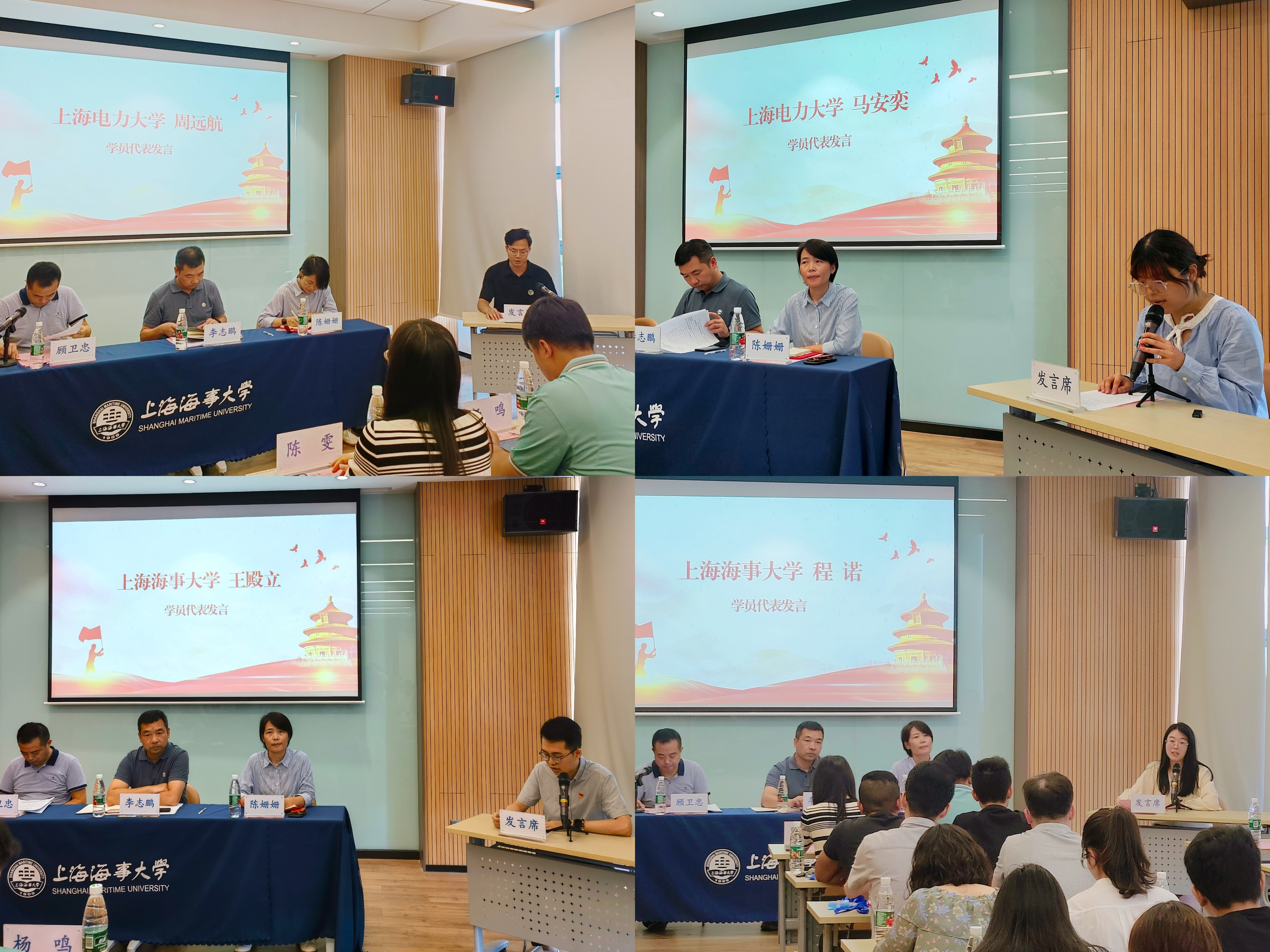 学员代表发言环节,上海电力大学周远航、马安奕,上海海事大学王殿立、程诺分别以“辅导员角色转变”“育人者必先育己,育己者方能育人”“辅之以情,导之以理,员之以梦”“正道直行、心存热爱”为题,分享了本次培训的所思所学以及对工作岗位职责的理解。