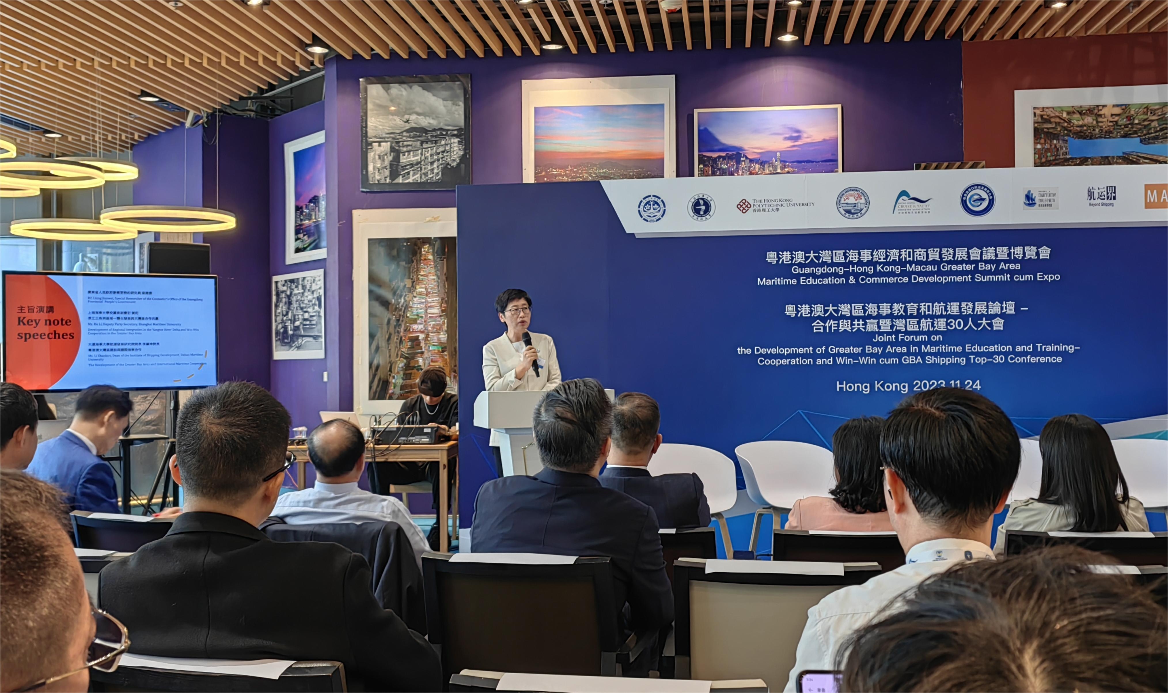 作为2023香港海运周系列活动之一,粤港澳大湾区海事教育和航运发展论坛于11月24日在港举行。香港特别行政区政府海运及港口发展专员陈婉雯、香港海运港口局推广及外务委员会主席刘瑞仪、香港船东会中国委员会主席赵式庆等嘉宾出席活动。贺莉受邀出席论坛并做主旨演讲。她指出,促进海事教育和港航业的发展关键在人才,她介绍了学校近年来在推动航运业发展方面取得的新进展,并提出了学校服务湾区港航事业的工作设想。此次论坛围绕海事教育和航运发展,汇集各方智慧,交流发展良策,是促进粤港澳大湾区航运发展的重要平台。