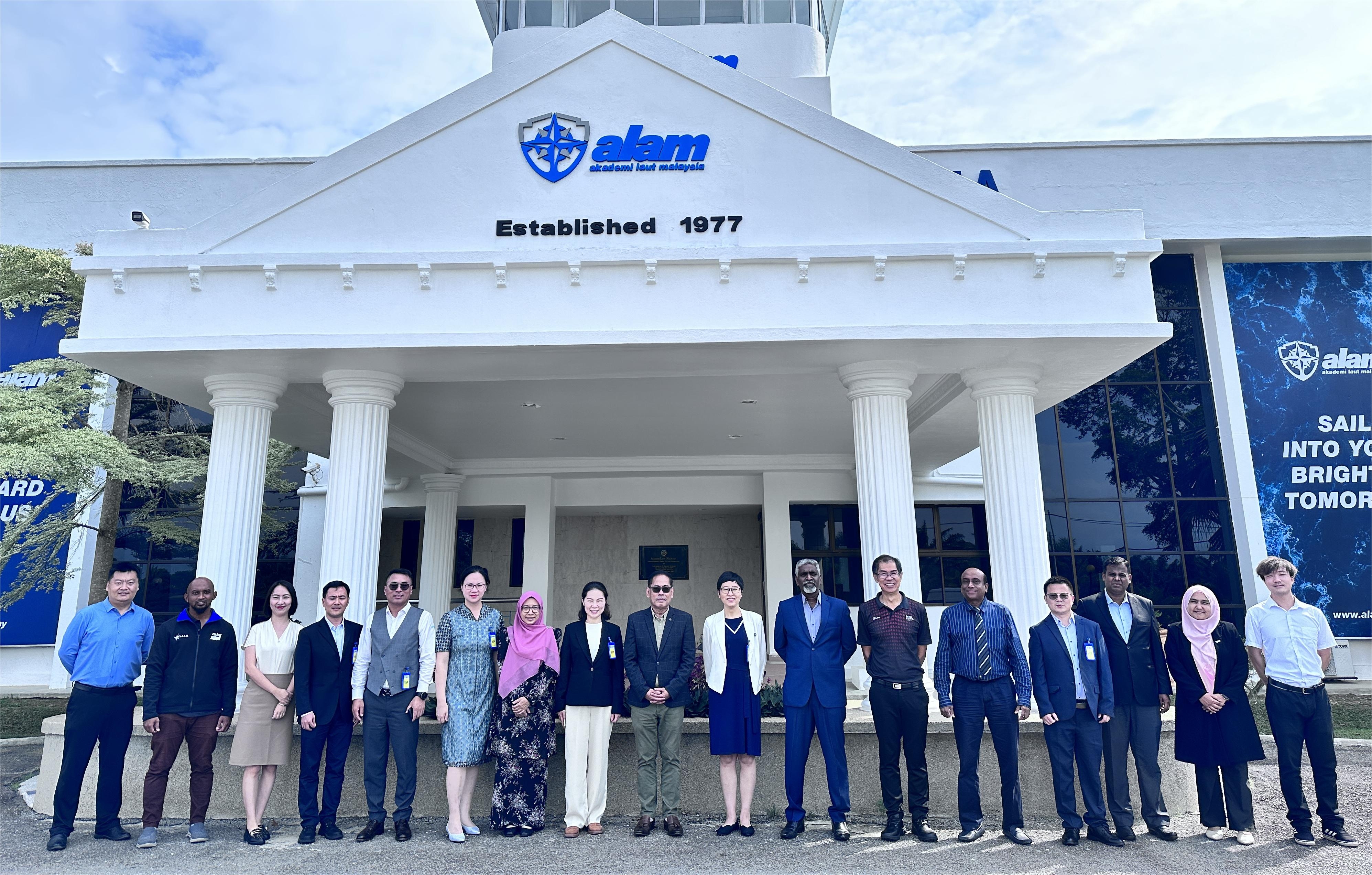 在马来西亚海运学院,出访团一行与该校校长汉姆丹·苏海米(Hamdan Suhaimi)教授等代表进行了会谈。贺莉重点介绍了学校航海类专业发展的最新情况。双方围绕学生联合培养、航运文化交流等领域进行了深入交流,并商谈签订合作备忘录的意向内容。会后,出访团一行参观了该校航海模拟器实验室、船艺实操实验室等教学设施设备。