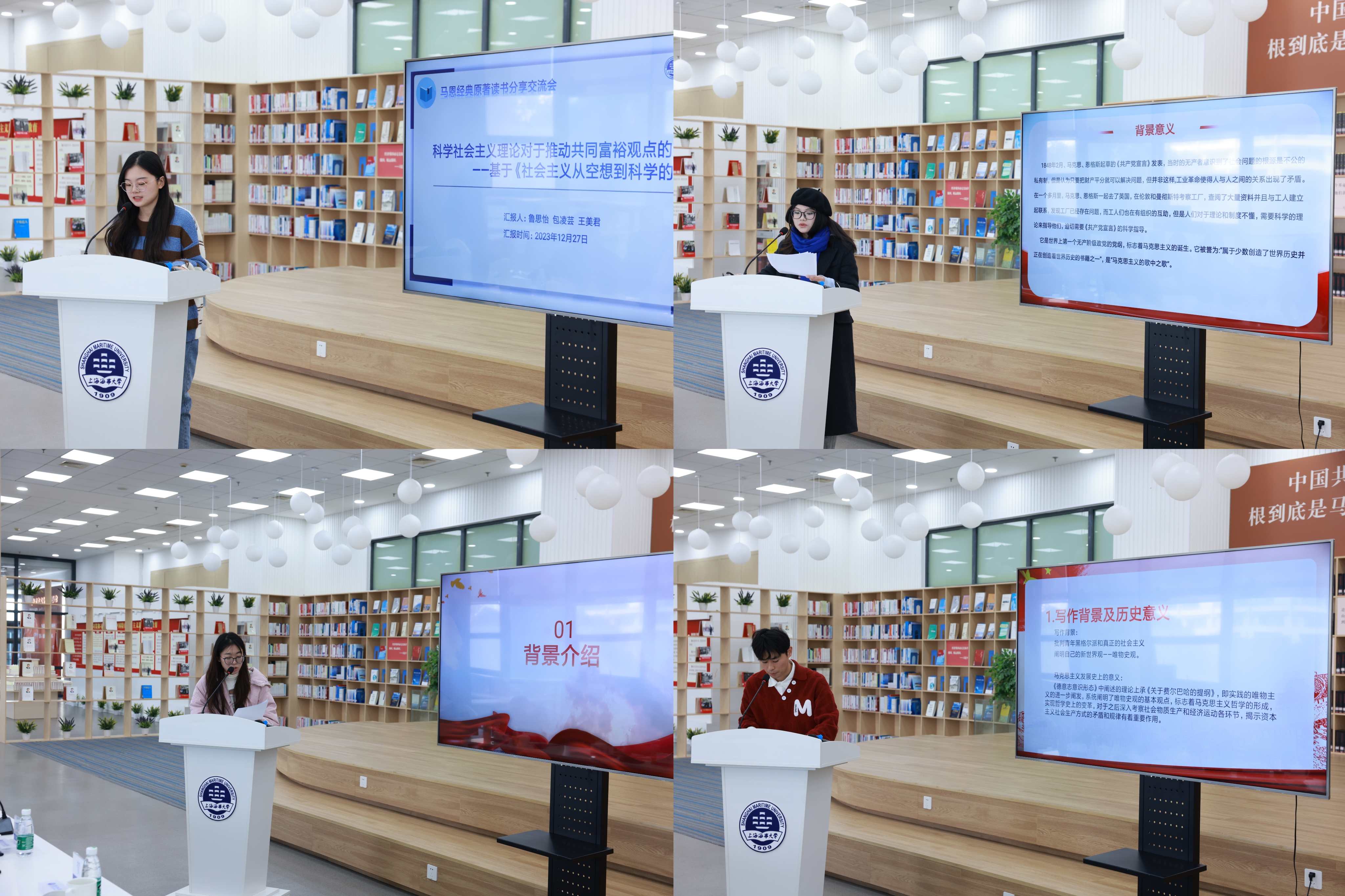 本次阅读交流分享会以“研读原著,学思践悟”为主题,研究生同学以马克思恩格斯经典著作的时代背景与写作背景为切入点,深入剖析原著经典的关键段句,感悟马克思主义理论的真理光辉,并结合现实谈了感想和体会。八个小组分别围绕马恩经典原著进行了阅读分享展示,包括追求真理扬起人类进步风帆的《共产党宣言》、实践探寻人类解放现实道路的《社会主义从空想到科学的发展》、揭秘异化劳动触动共情心弦的《1844年经济哲学手稿》以及哲学视野催生变革力量的《德意志意识形态》,各小组代表进行主要发言分享,小组成员进行了补充。