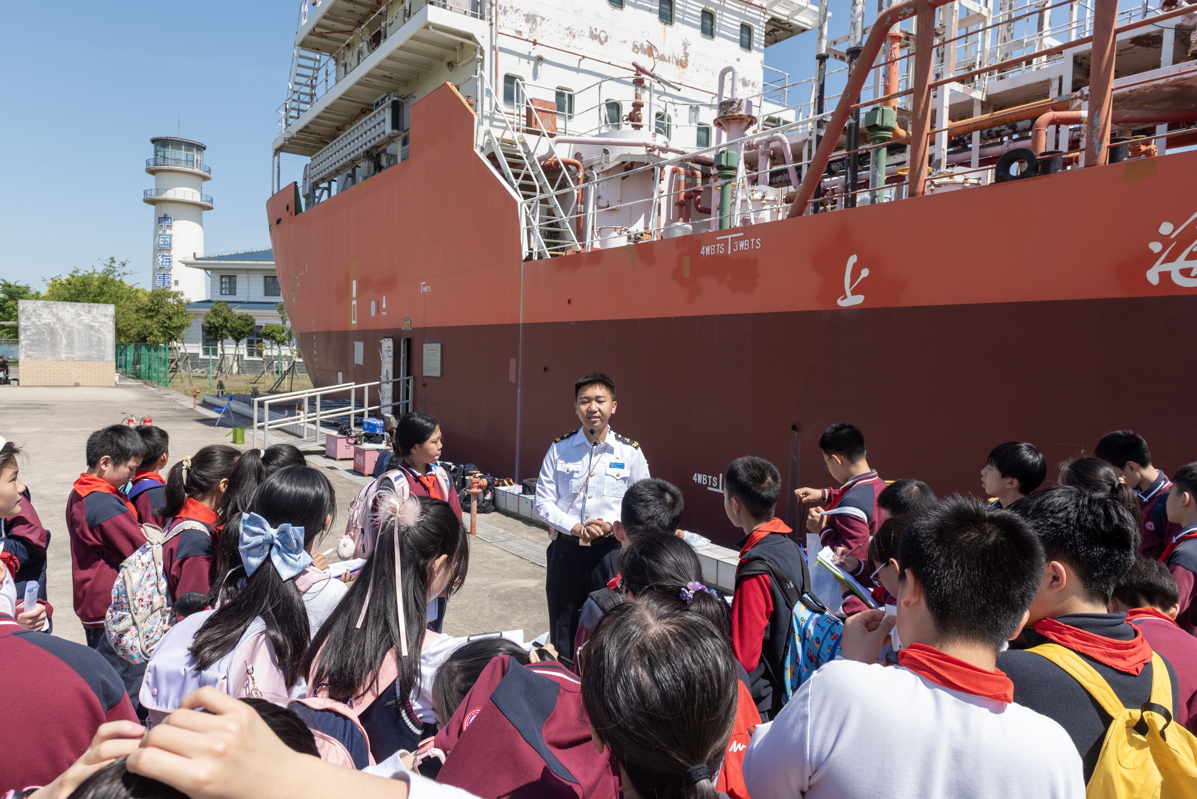 学生讲解员带领华二前滩学校的同学们参观了“吴淞”号组合式模拟液货船,为他们详细介绍了“吴淞”轮的历史和轮船体结构与功能,科普了海上航行过程中的工作生活,还针对同学们感兴趣的船舶设备、导航通信等进行了深入交流。同学们通过参观学习了解到,“吴淞”轮不仅是上海海事大学“海上虚拟课堂”,也是国内外培养液货船员规模最大、功能最齐全的实训基地。