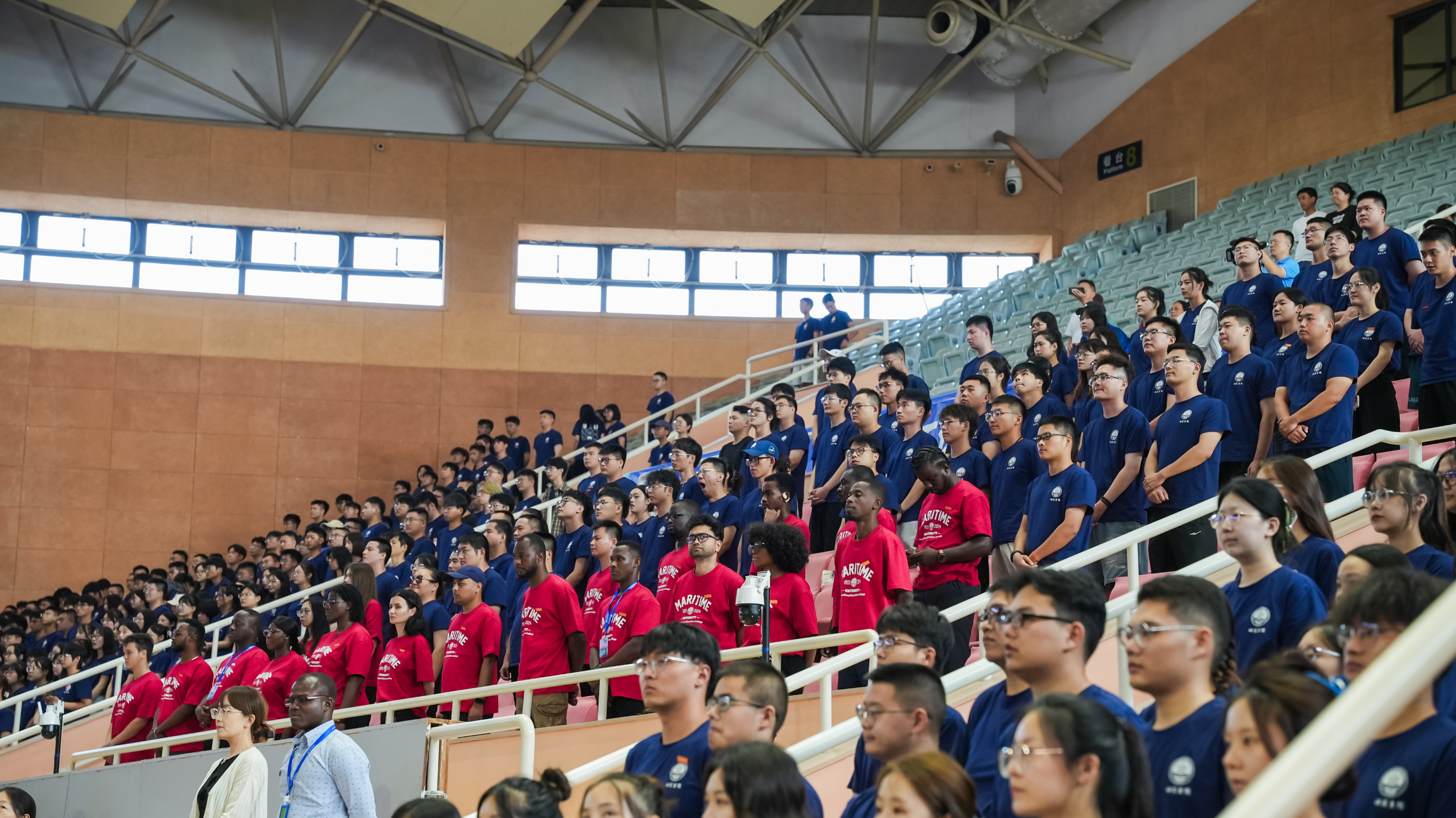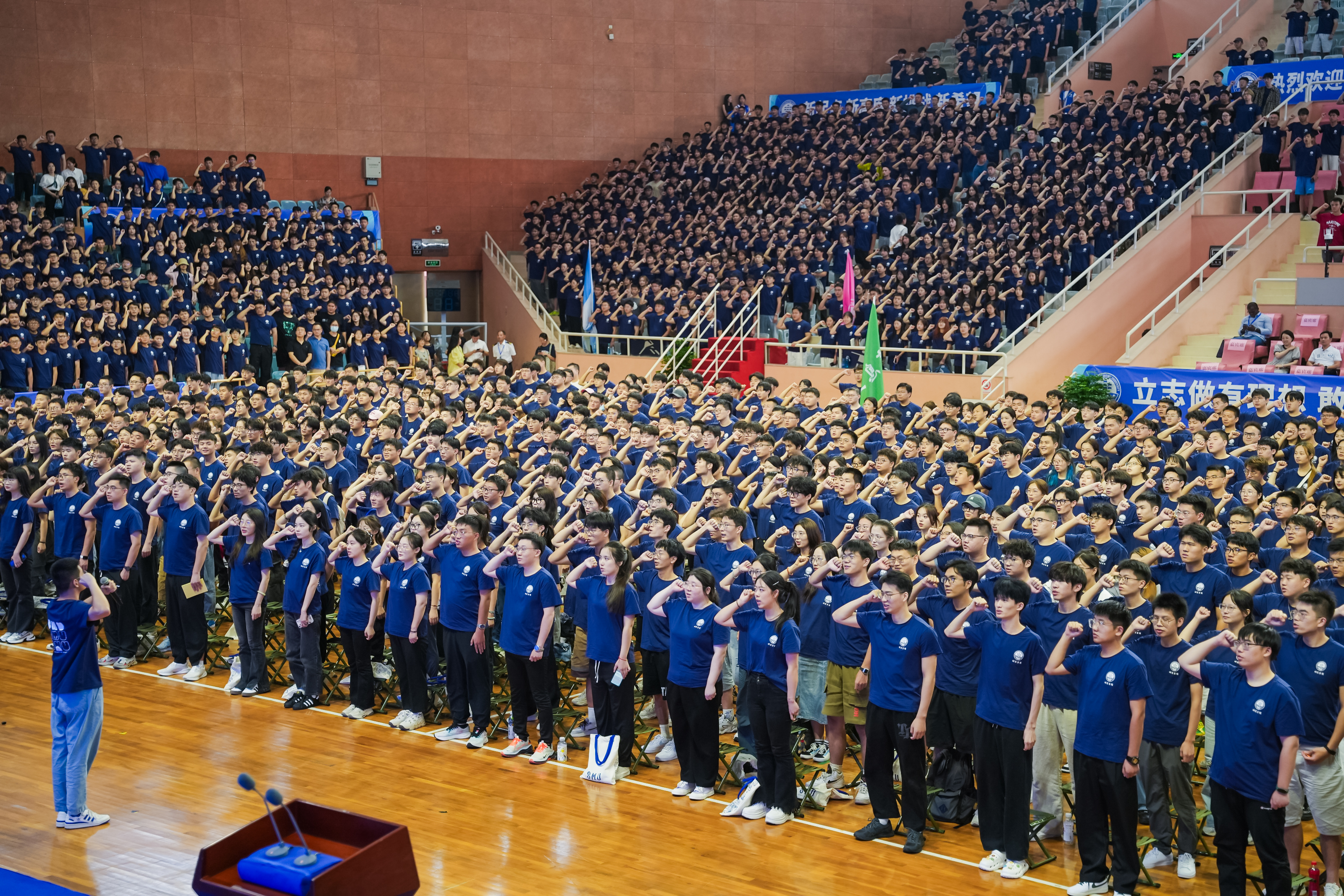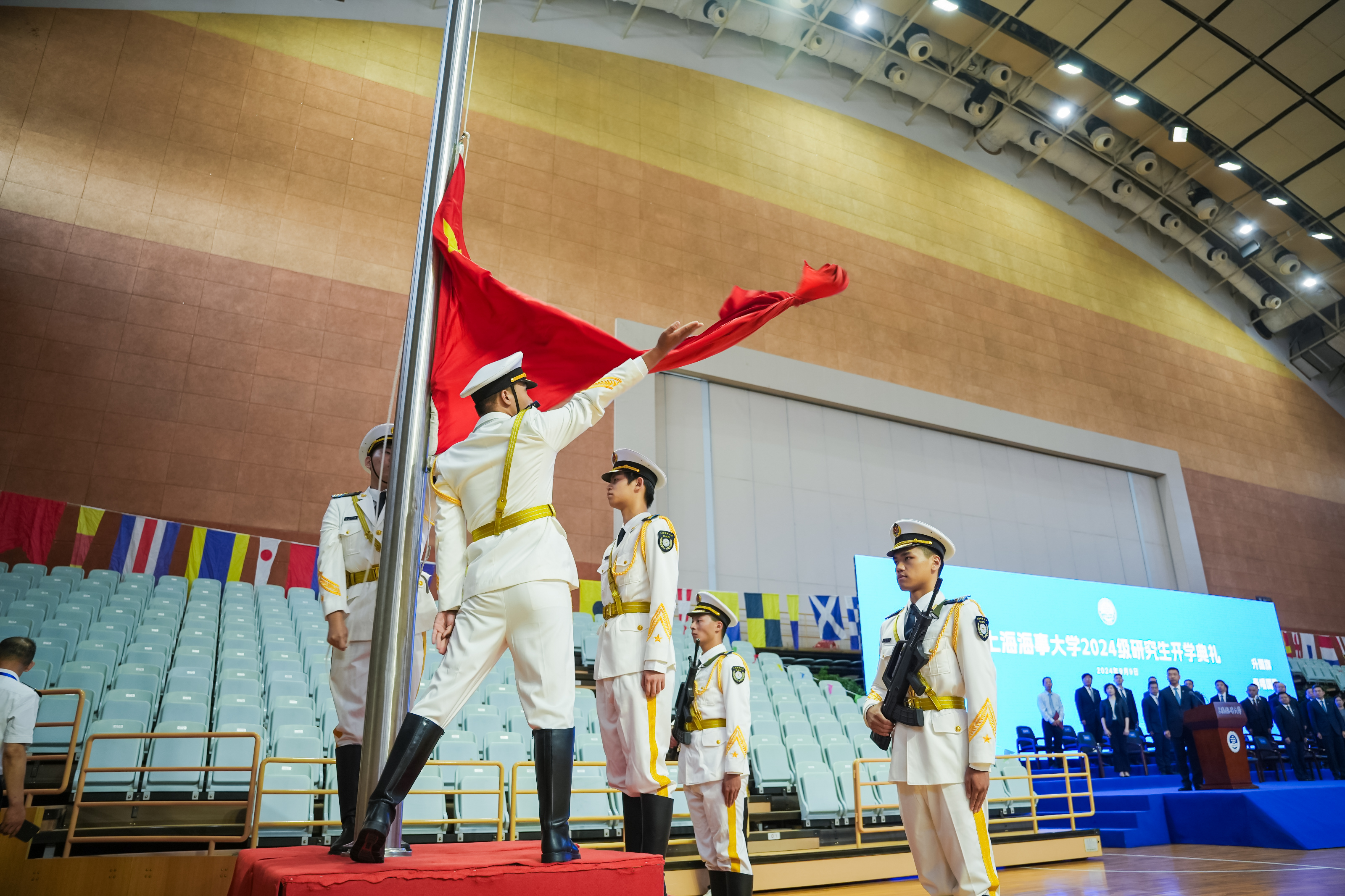 典礼最后,物流科学与工程学院2024级博士研究生张港平同学带领全体研究生新生宣誓,全体师生齐声合唱《上海海事大学校歌》。