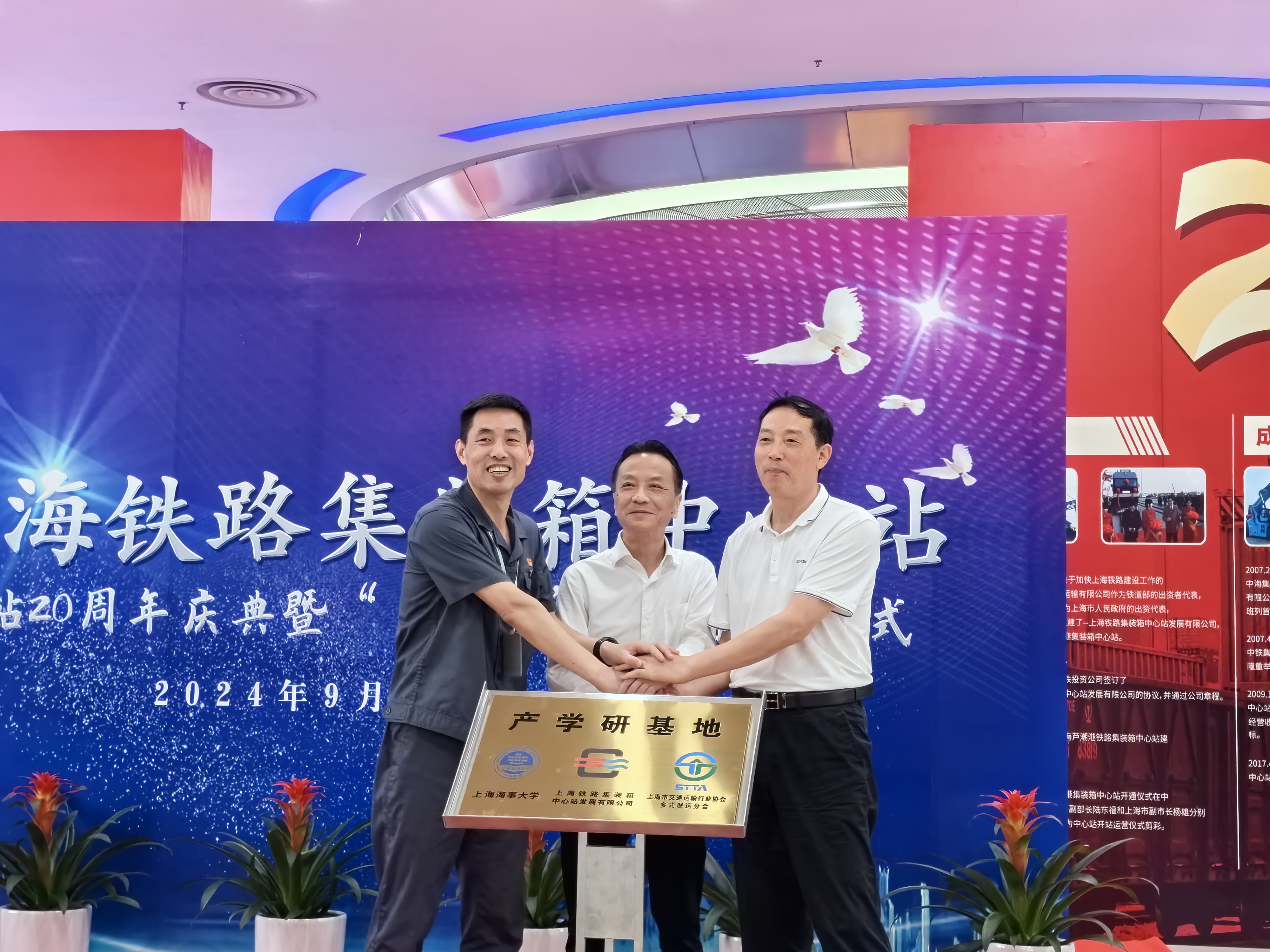 9月20日,上海铁路集装箱中心站建设20周年活动暨“产学研”基地揭牌仪式在芦潮港铁路中心站举行,副校长严伟、上海市交通运输行业协会会长任纪善、上海市交通运输行业协会多式联运分会会长刘建堂、上海铁路集装箱中心站发展有限公司总经理俞武骏出席。