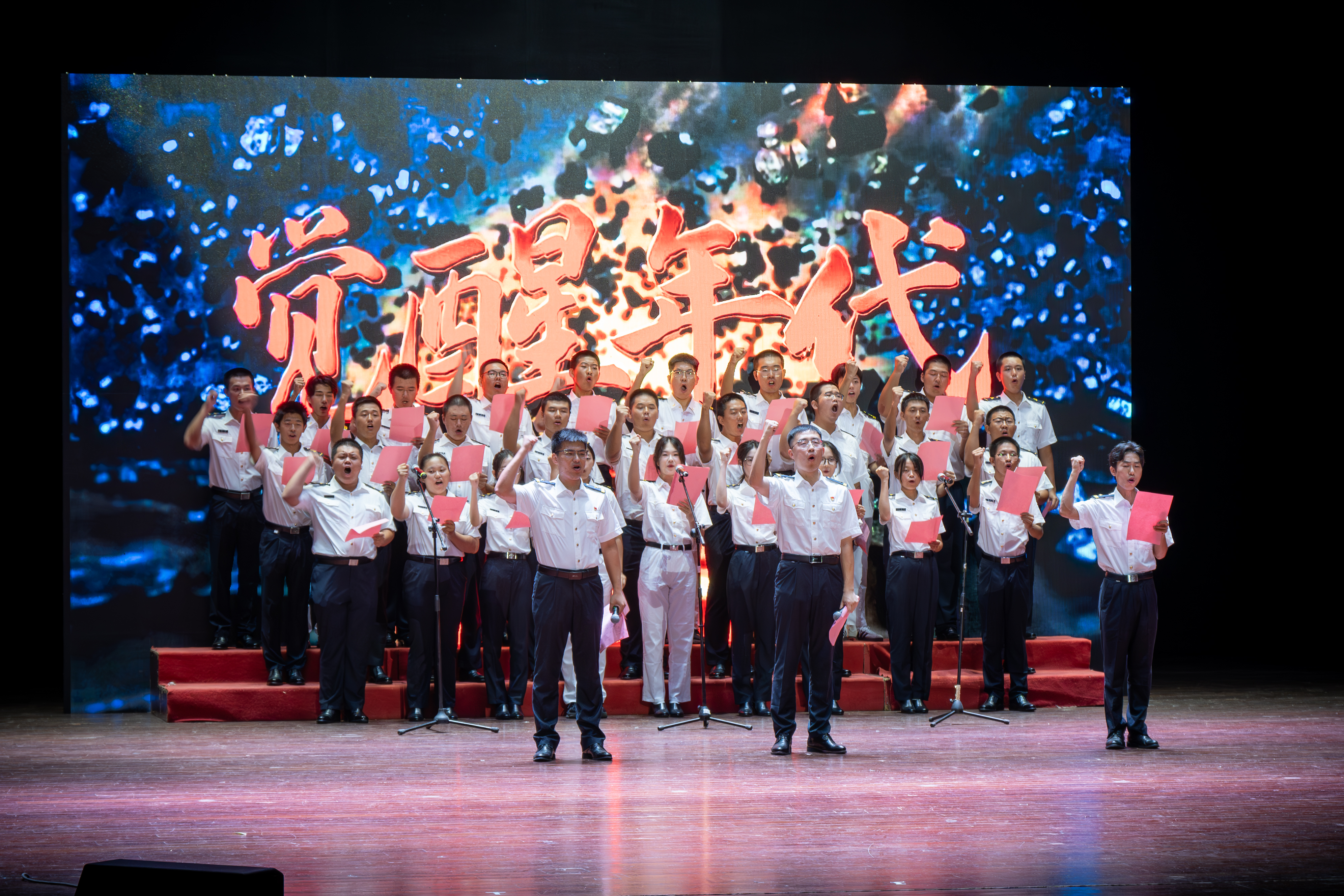 在序章“光辉启程瀚海扬帆”,仪仗队身着整齐制服,手持鲜艳的五星红旗,步伐铿锵、神情肃穆,缓缓步入舞台,全场观众庄严肃立,奏唱国歌。礼毕后,由旗语队带来《旗帜飘扬,岁月如歌》,旗语队队员整齐划一地用旗语表达出“庆祝中华人民共和国75周年”,用航海人的方式传递了衷心的祝福。