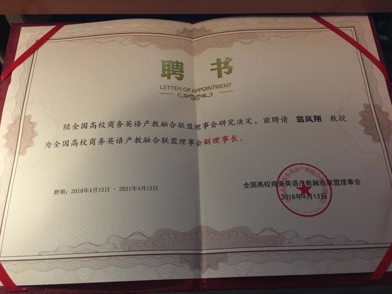 4月14日,2018年新时代商务英语教育高峰论坛暨全国大学生职场与商务英语沟通技能启动仪式在浙江乌镇举办。高峰论坛上,成立了“全国高校商务英语产教融合联盟”,我校外国语学院翁凤翔教授当选为首届理事会副理事长。