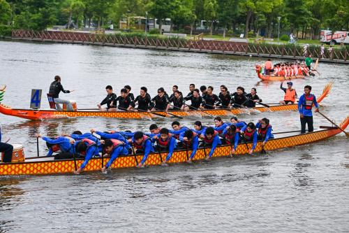 在与会嘉宾共同为龙舟点睛的美好祝愿中,比赛拉开了帷幕。本次参赛的23支队伍,由上海市高校团学骨干以及留学生等组建而成。随着岸边汽笛声响起,赛道内的龙舟如蛟龙出海,踏着鼓点扬起滚烫的澎湃,各队伍动作整齐划一,奋力划动船桨,在碧波上快速穿行。两岸观众屏气凝神地注视着,在龙舟一一冲过终点时,响起大家的喝彩声。