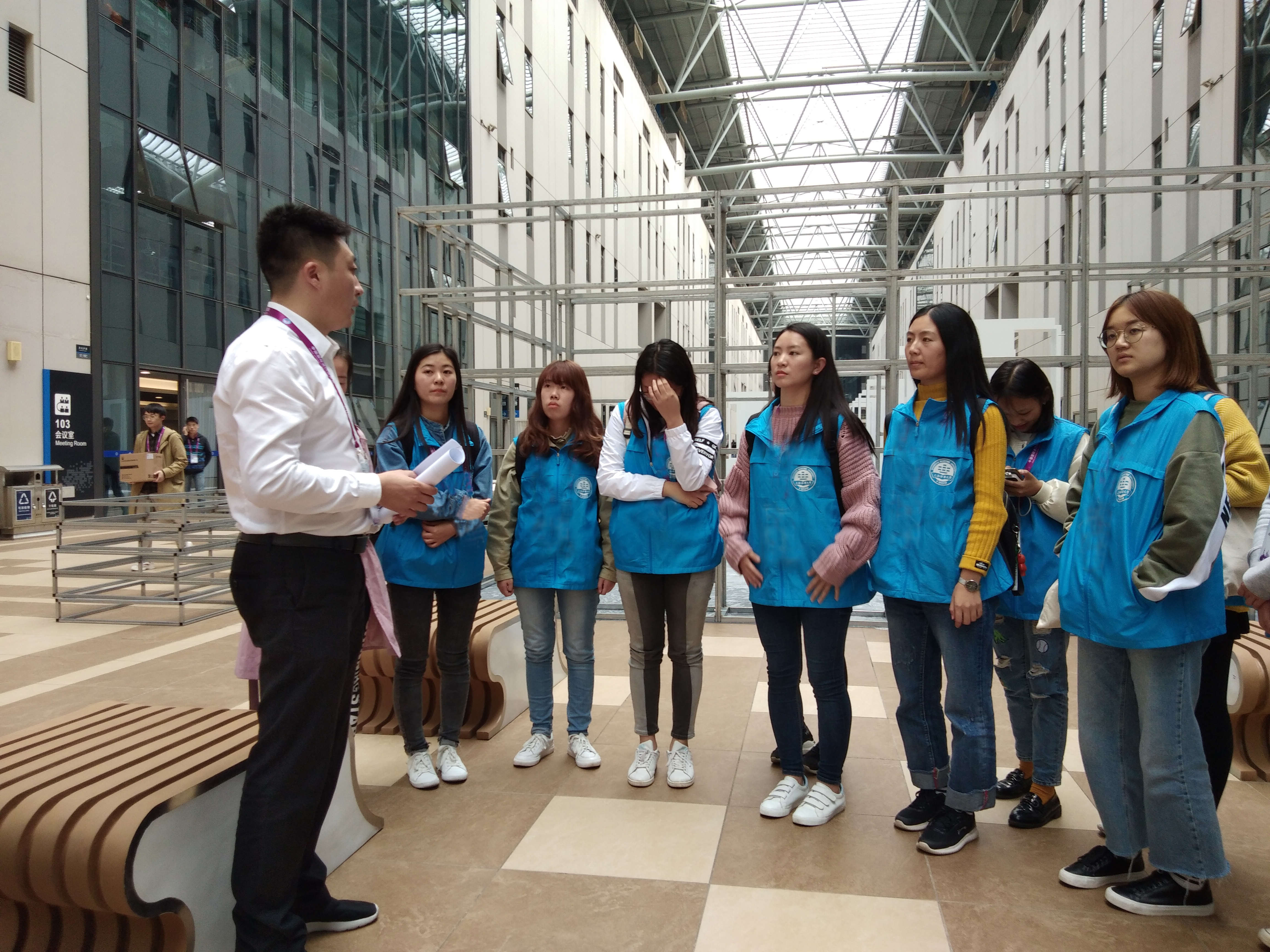 2018年10月24日,我校六十余名志愿者在学生服务中心门口集合完毕,一同前往国家会展中心,准备正式参与到首届中国国际进口博览会的前期准备工作中。
