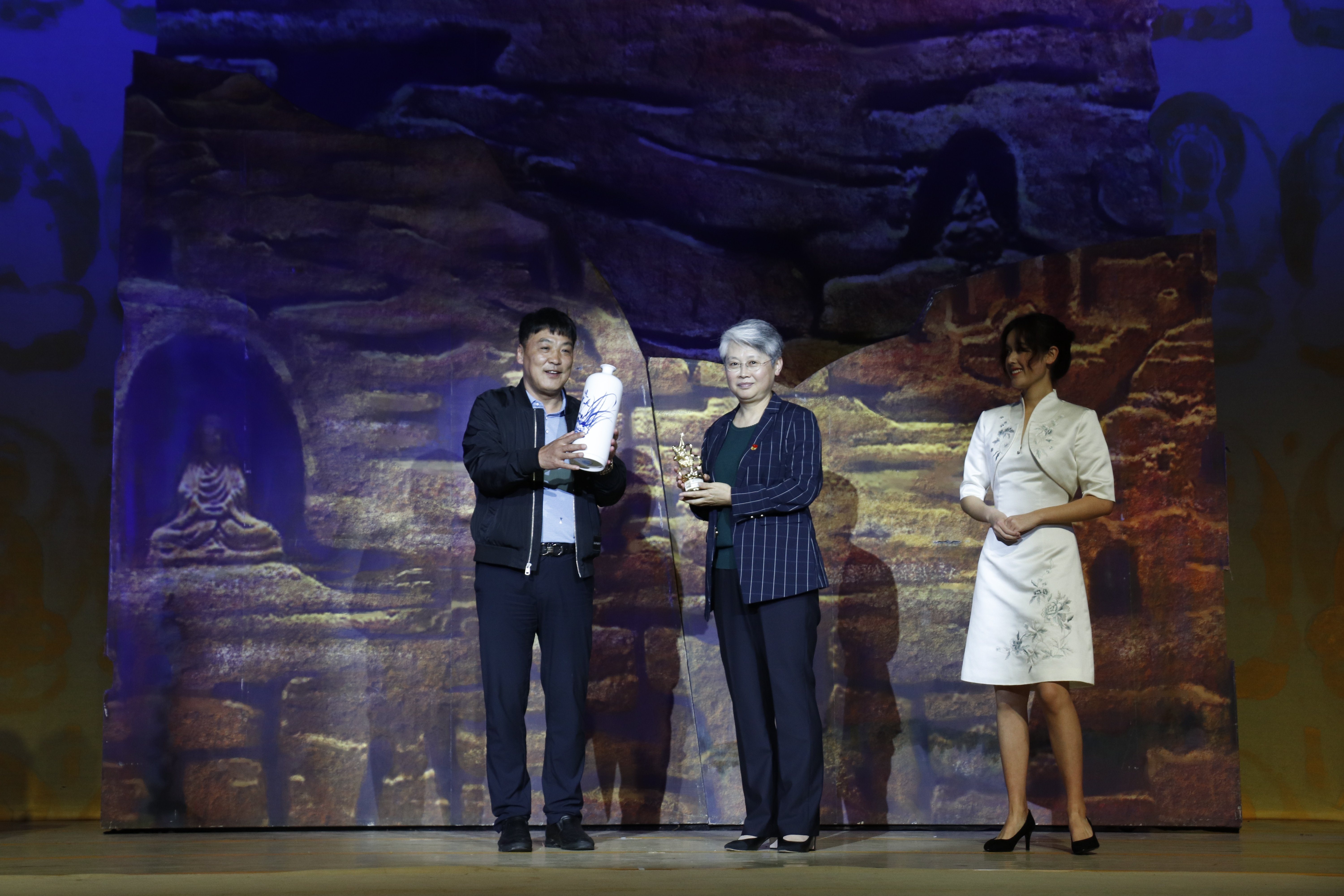 图1.上海海事大学党委副书记、纪委书记门妍萍与兰州演艺集团总经理王维祥上台互赠礼物