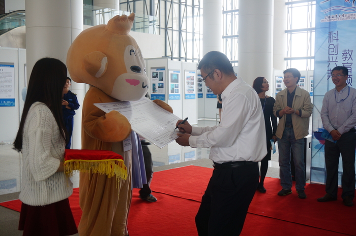 开幕式上,装载着航运物流节吉祥物LOGO的快递车缓缓驶来,杨万枫副校长签收了快递并致辞。他从国家提出“海洋强国”战略的宏观视角,肯定了“海大人文”系列活动对于学校培养人才的意义,希望海大学子通过此次航运物流节增进知识、开拓视野,激发创新创业的兴趣和热情。