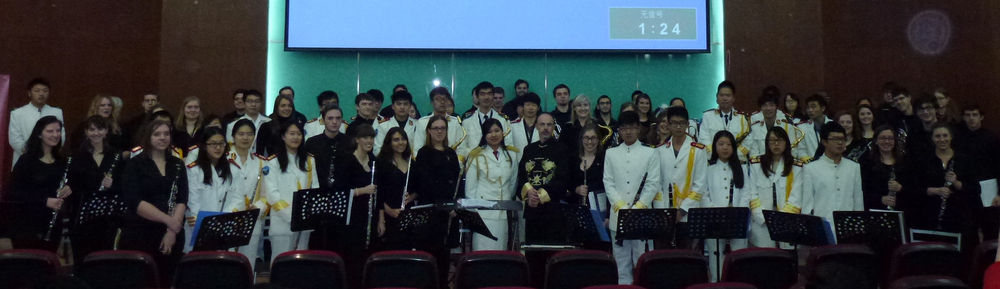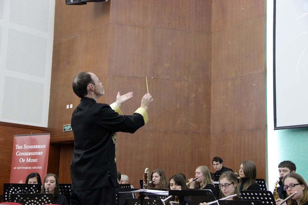 盖茨堡学院桑德曼交响管乐团在Russell McCutcheon教授指挥下演奏了美国经典音乐作品《越过海洋的握手》《盖茨堡的胜利》《猫鼠游戏》等经典音乐,我校交响管乐团在马骅老师的指挥下演奏了《永远的军乐》《征服世界》《非洲交响曲》等经典音乐。