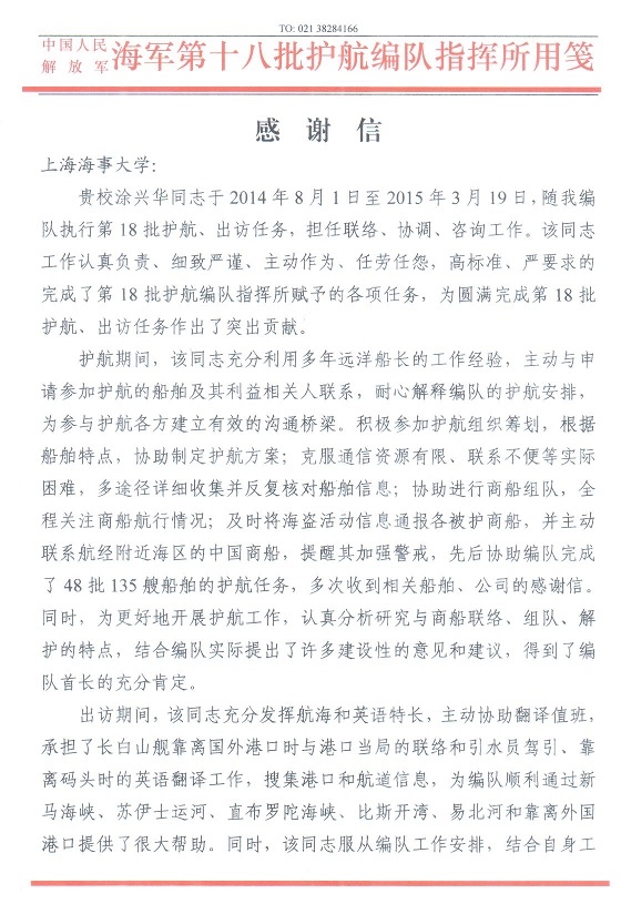 近日,中国海军第18批护航指挥员张传书少将和编队政治委员周名贵少将代表海军南海舰队,专门致信上海海事大学,对学校派出涂兴华船长全力配合做好护航工作表示衷心感谢,对7个多月来与海军官兵并肩作战,恪尽职守,任劳任怨,为编队圆满完成护航任务做出突出贡献的涂兴华船长表示崇高的敬意。