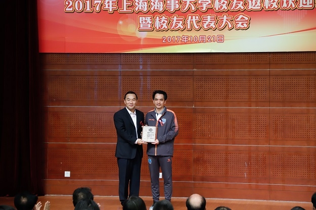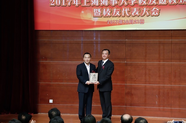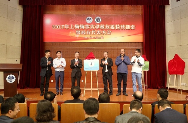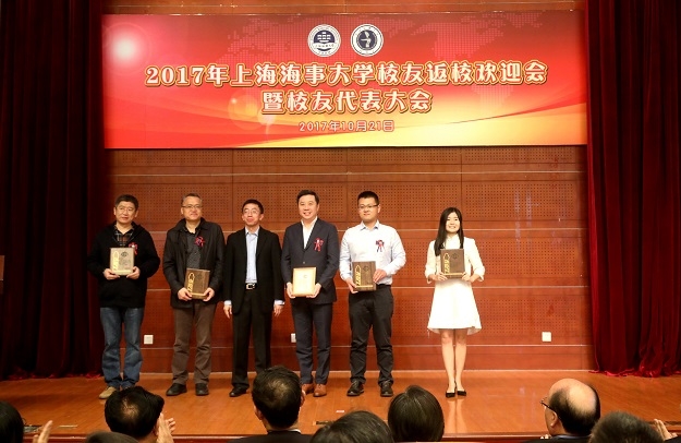严伟副校长为《上海海事大学校友园地》优秀作品奖获得者,1977级外语专业校友张国平(作品《1977那一年——纪念高校恢复高考40年》)、1979级水运管理系财会专业校友傅俊元(作品《传承:父女海大情》)、1982级水运管理系财会专业校友石兴(作品《圣地延安情·诗词两首》)、1984级国际航运专业校友刘艳华(作品《青春飘过三十年》)、1989级水经财会系校友陈海波(作品《母校的味道》)颁奖;并分别与闻健明会长、许竞学校友、夏国和校友共同为校友高尔夫俱乐部、校友帆船俱乐部和校友篮球俱乐部揭牌。