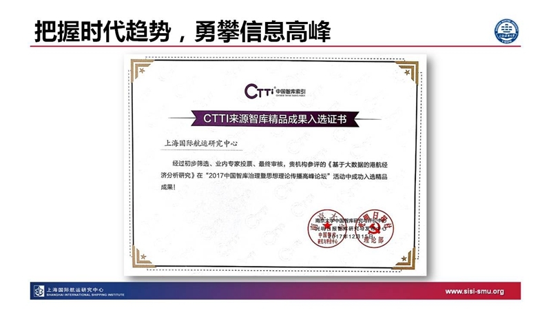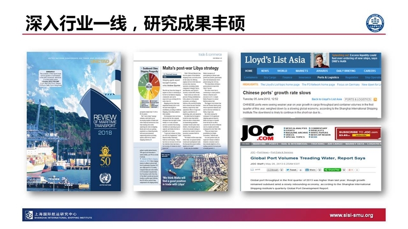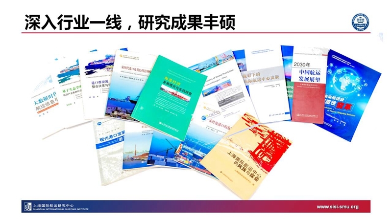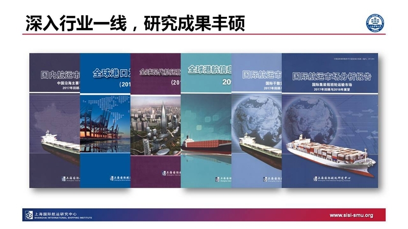 成立十年来,研究中心承接各类项目300余项,发表论文230余篇,出版专著20余本;公开发布行业报告1200余份。近年来,研究中心每年推出一项前瞻性研究报告,《航运业颠覆性变革》《2030中国航运发展展望》等引起业界巨大反响,受到广泛瞩目。研究成果被彭博社、英国《每日电讯报》、中国交通报、新华社经济参考报等境内外媒体广泛报道。研究中心坚持每月邀请国内外专家围绕市场热点和行业需求组织公开讲座,每年参加人数超过1000人,为行业知识普及和专业素质培养提供了一个开放的平台。研究中心发布的《中国航运景气指数报告》成为重要的航运风向标,该指数已经成为我国水运经济运行的重要指标,被业内视为中国航运业的“晴雨表”;《全球港口发展报告》成为联合国贸发大会(UNCTAD)定期编制的《海运回顾》的重要数据引用来源,该报告已经在全球范围内获得了业界广泛认可。港航大数据实验室多次为上海海事局提供在船舶碰撞事故中逃逸的嫌疑船舶分析,为上海港提供智慧港口研究方面的咨询意见和数据支持,实验室研发的大数据算法已通过了华为物流中心的评审,被应用到华为全球供应链管理解决方案之中。