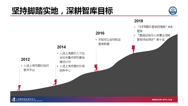 上海海事大学上海国际航运研究中心(以下称“研究中心”)于2008年7月正式成立。研究中心全体人员坚决贯彻执行党的高等教育与科学研究方针政策,牢固树立“四个意识”,坚定“四个自信”,坚决做到“两个维护”,牢记“政府航运政策制定的智库、港航企业发展决策的依托”的初心使命,经过十年砥砺奋进,为建设航运强国的国家战略和上海国际航运中心建设做出了贡献,取得了可喜的成绩。