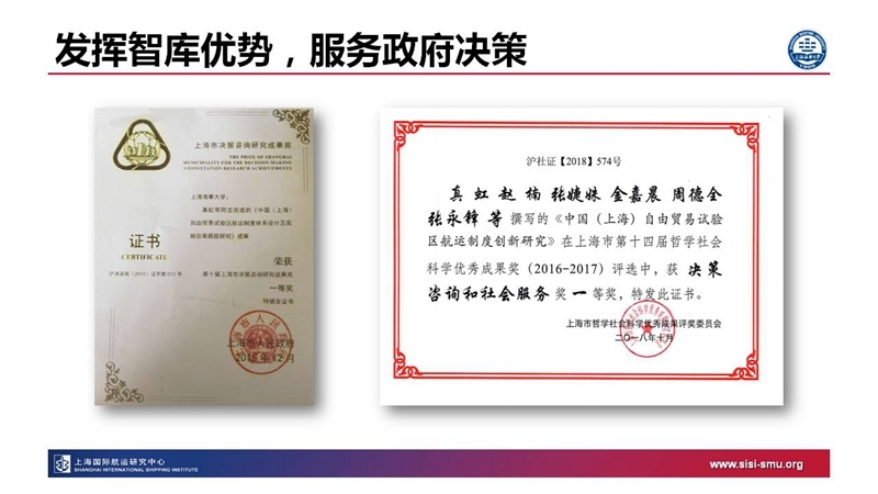 研究中心提交专报、内参共计124份,其中20篇获省部级领导批示,更有数篇曾分别获得温家宝、李克强、张德江、张高丽等党和国家领导人批示。殷明教授等研究人员在中央电视台“新闻联播”、“新闻直播间”等新闻类节目,上海电视台“财经频道”等财经类节目中作为行业专家发表观点。研究中心承担的“上海国际航运中心建设‘十二五’规划”“‘十三五’时期上海国际航运中心建设规划”成果被纳入上海市人民政府印发的《上海市加快国际航运中心建设“十二五”规划》《“十三五”时期上海国际航运中心建设规划》,《自由贸易试验区航运负面清单和监管机制及模式研究》成果直接转化为2014、2015版自贸区航运负面清单。承担的《邮轮管理条例》《游艇管理条例》研究工作,为相关条例出台提供了研究储备。另有数项专题研究成果已成为天津、广州、重庆等地指导航运中心建设的纲领性文件。依托上海市人民政府发展研究中心决策咨询课题平台,研究中心围绕“国际航运中心专项”基金,发布完成了74项课题研究,这些研究形成的研究报告和专报均提交给相关政府部门参阅,为上海国际航运中心建设提供了重要的智力支持。研究中心承担的项目《完善上海国际航运中心建设推进机制及资源整合研究》《“国际航运发展综合试验区”内涵及相关政策的研究》等7项成果获得上海市决策咨询奖,包括第九届、第十届上海市决策咨询研究成果奖一等奖。《中国(上海)自由贸易试验区航运制度创新研究》荣获上海市第十四届哲学社会科学优秀成果决策咨询和社会服务奖一等奖。