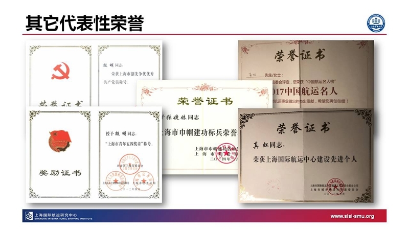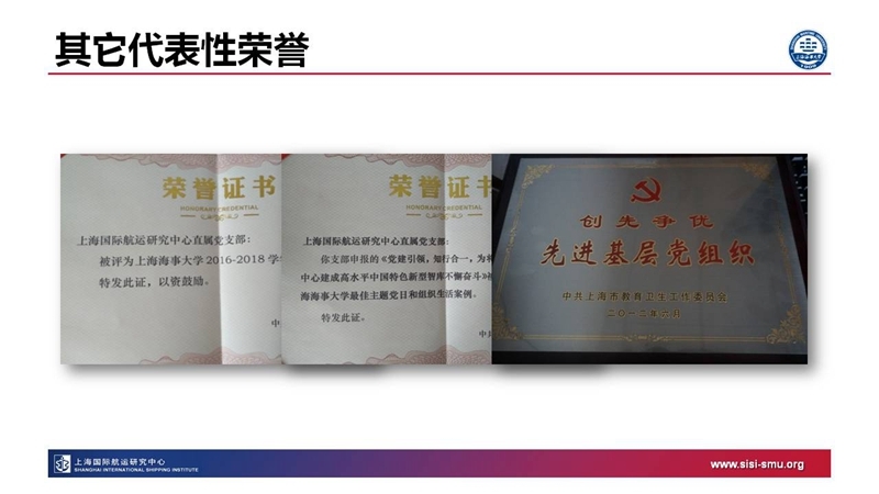 研究中心于2012年被列为上海市第一批高校知识服务平台;2014年入选上海高校人文社会科学重点研究基地建设计划,同年入选上海市高校协同创新中心;2016年联合亚、美、欧洲9个国家和地区的13个智库机构发起成立全球航运智库联盟,成为服务上海“四大品牌”建设的亮点之一;2018年被南京大学和光明日报联合发布的中国智库索引(CTTI)列为“CTTI高校智库百强榜”A类智库,位居“基础设施与公共事业领域智库综合测评”前十,也是全国唯一一家入选的航运专业智库。