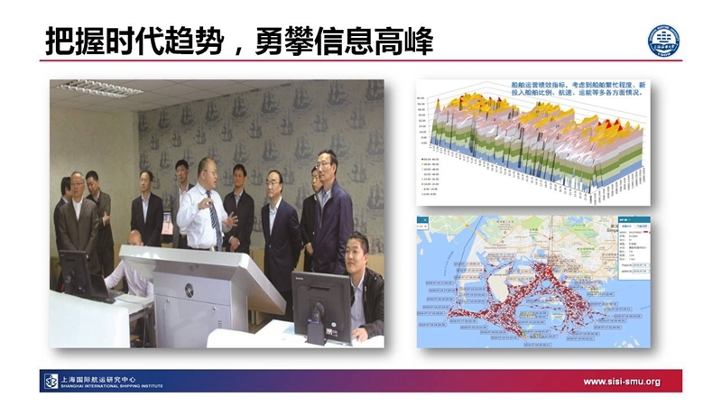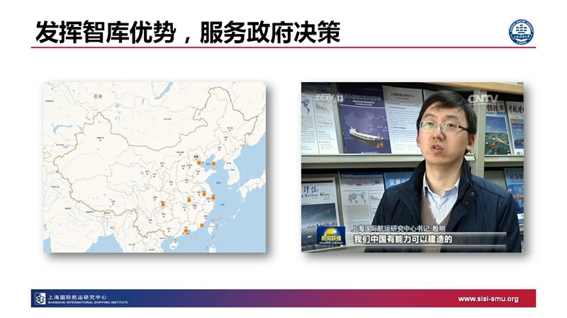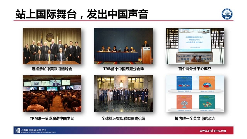 2014年,研究中心成立了第一家海外分中心——新加坡分中心,为上海国际航运中心建设提供新加坡情报参考。2015年,美国交通委员会(TRB)年会首个中国相关专题分会场“从全球贸易视角看中国港航发展”在华盛顿会议中心召开,这是交通运输领域最具权威的全球性学术会议,参与者逾万人。此次专题分会场由研究中心策划并承办,成为面向全球介绍中国港航业发展的重要窗口。2016年,研究中心联合亚、美、欧洲9个国家和地区的13个智库机构发起成立全球航运智库联盟,这是引导全球航运业的健康发展,推动航运智库与国际组织、各国政府、业界之间的良性互动的全球首个航运智库平台。2018年,殷明教授作为唯一一名来自中国的专家应邀赴美,在全球最大规模的跨太平洋海运年会(TPM)上发表大会演讲及分会场专场演讲,取得了良好的业界反响。研究中心主要报告产品均发行英文版,并发行境内唯一一本全英文港航杂志——China Shipping & Ports,向国际航运舞台持续发出中国声音。研究中心还两次与经合组织(OECD)合作,共同发布研究成果。