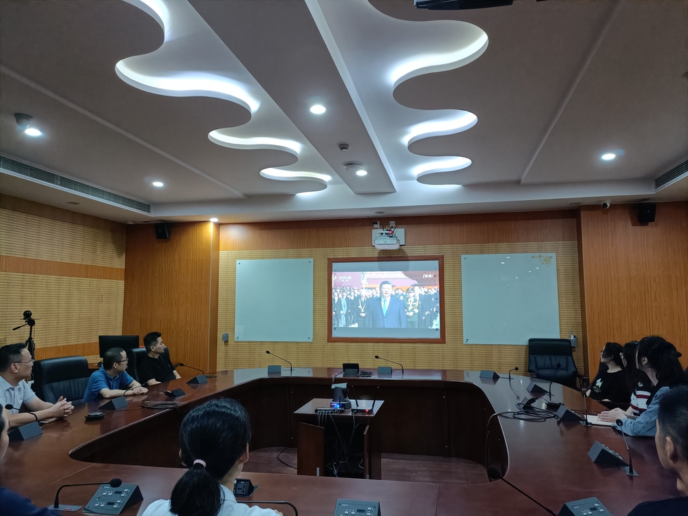 图7 外国语学院党委组织学院班子成员及师生代表集中观看向人民英雄敬献花篮仪式电视直播