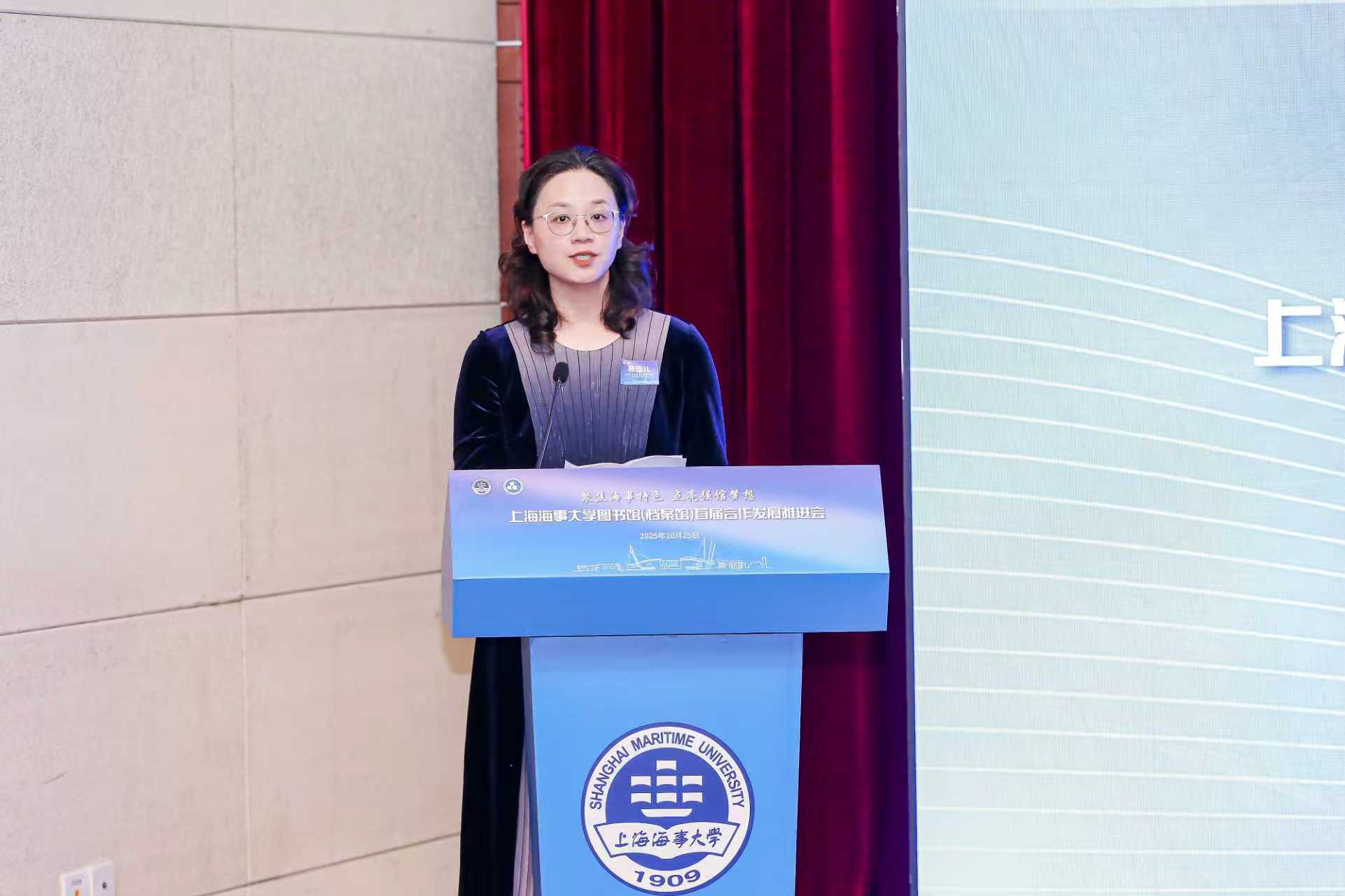 图书馆(档案馆)直属党支部书记陈佳儿作"聚焦海事特色,点亮强馆梦想"主旨报告,提出要坚持“特、精、专”办馆方针,通过举办合作发展推进会及海洋海事文化论坛、打造高端智库等举措,点亮强馆梦想、擦亮海大名片。