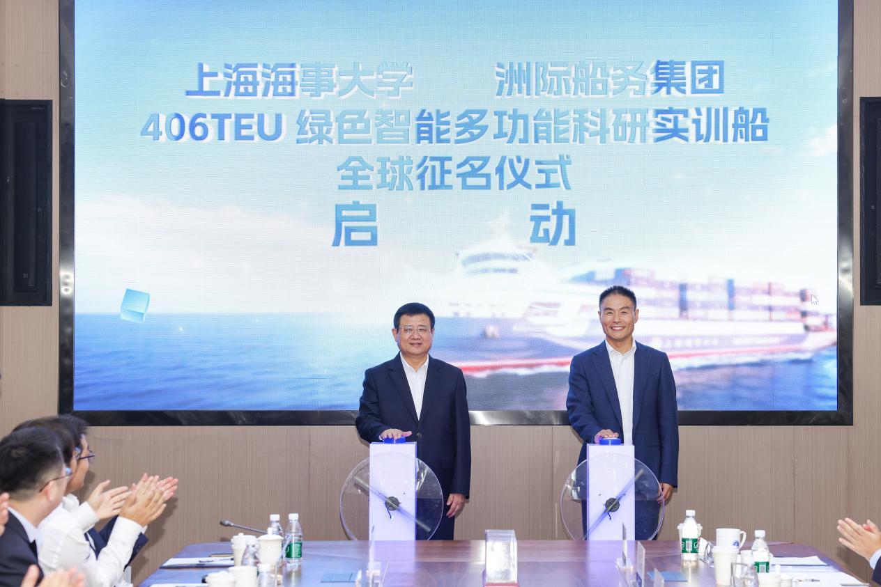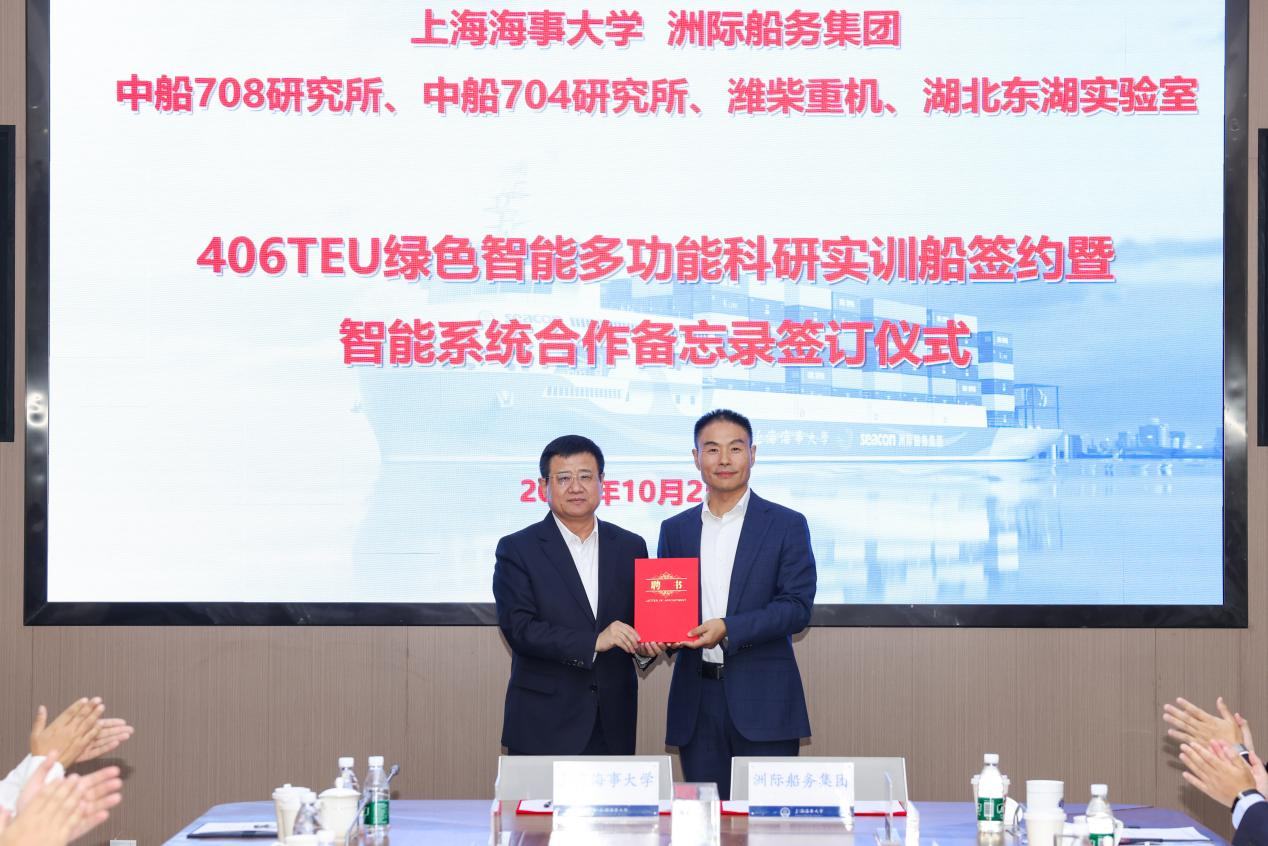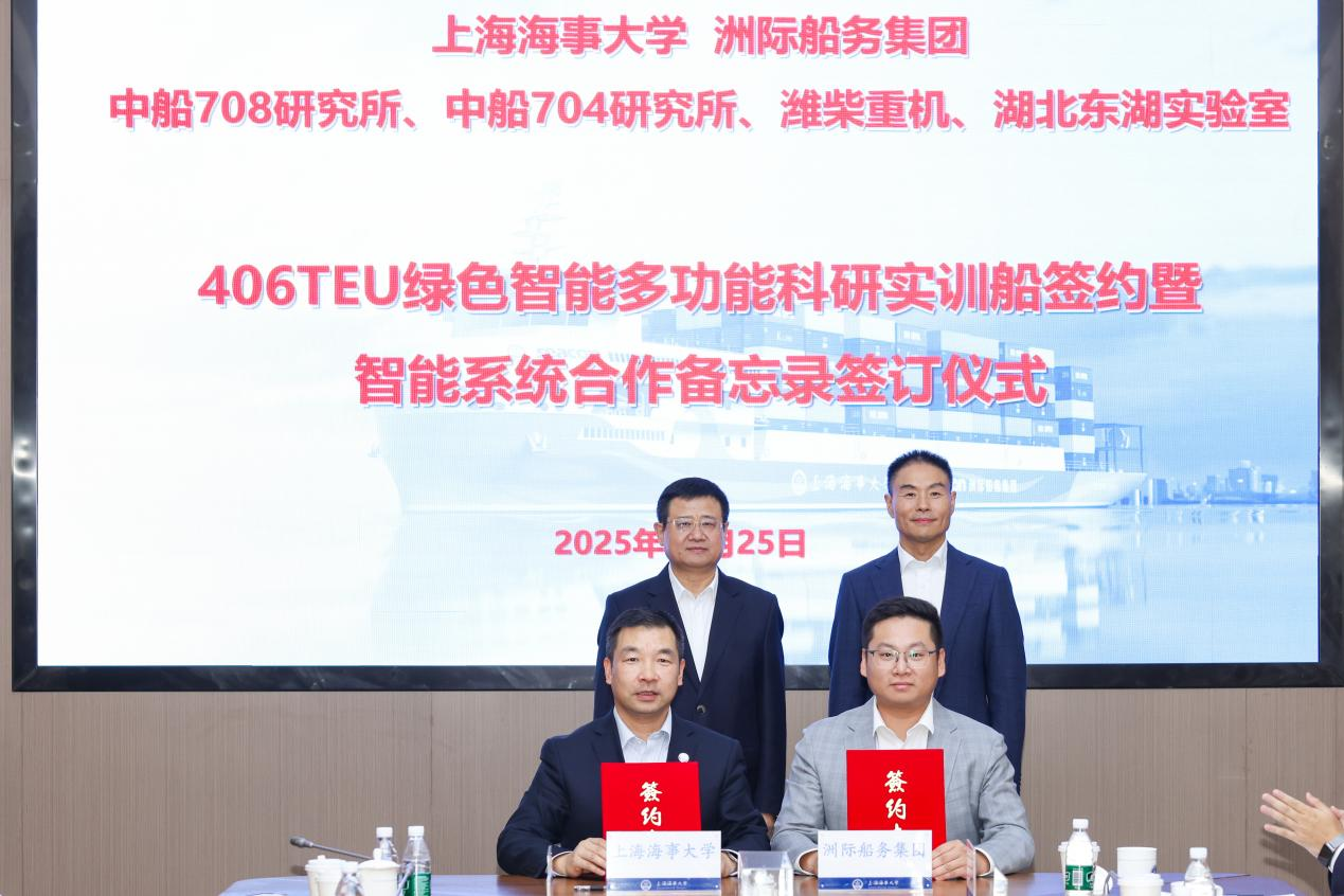 2025年10月25日,上海海事大学与洲际船务集团控股有限公司(简称“洲际船务集团”)在临港校区签署“绿色智能多功能科研实训船”(简称“科研实训船”)协议,并联合多家单位签订科研实训船智能系统合作备忘录。校党委书记宋宝儒、洲际船务集团董事长郭金魁、中国船舶集团第七〇八研究所总工程师黄蔚、中国船舶集团第七〇四研究所产业发展部主任朱晓清、东湖实验室绿色交通创新中心副主任邓芳、潍柴集团总经理助理尹晓青等嘉宾出席,签约仪式由校党委副书记兼副校长李志鹏主持。