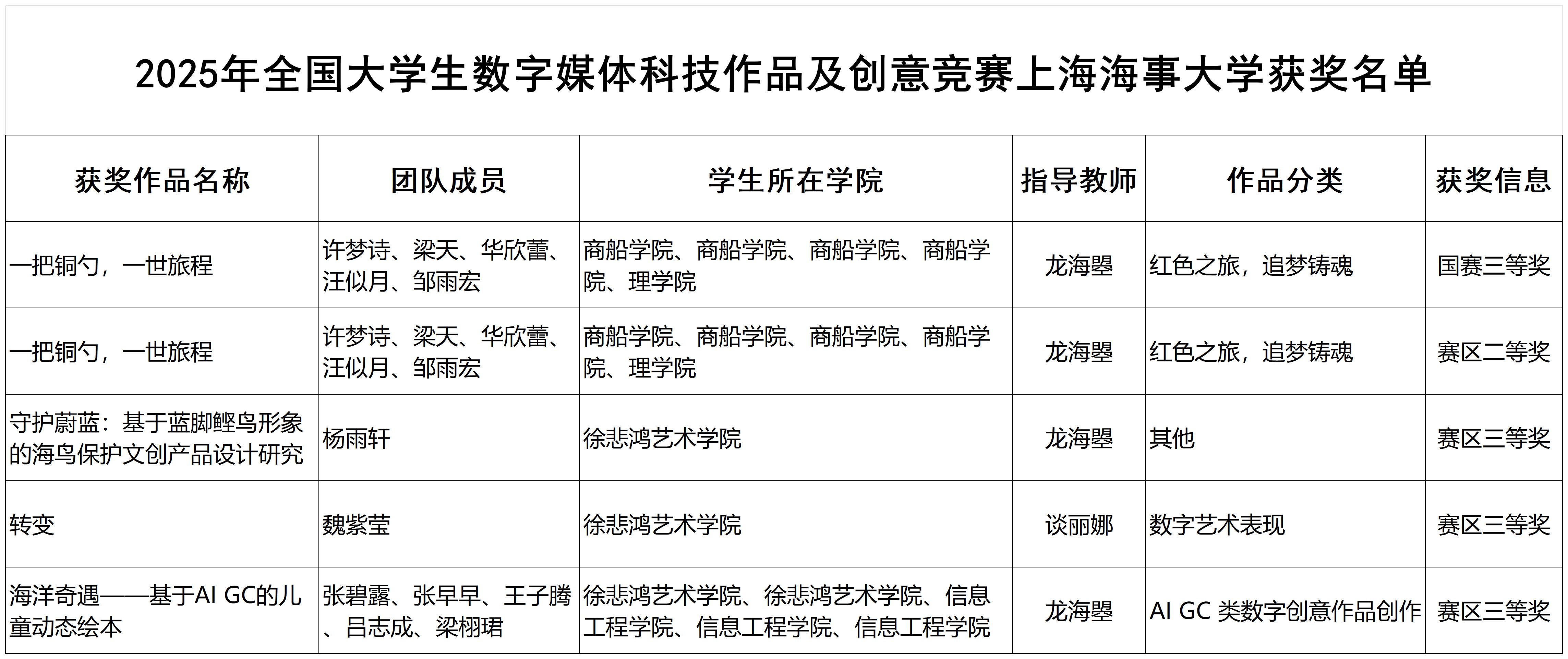 日前,2025年全国大学生数字媒体科技作品及创意竞赛评审工作结束,上海海事大学学子凭借扎实的专业功底与出色的创意表现,斩获佳绩。