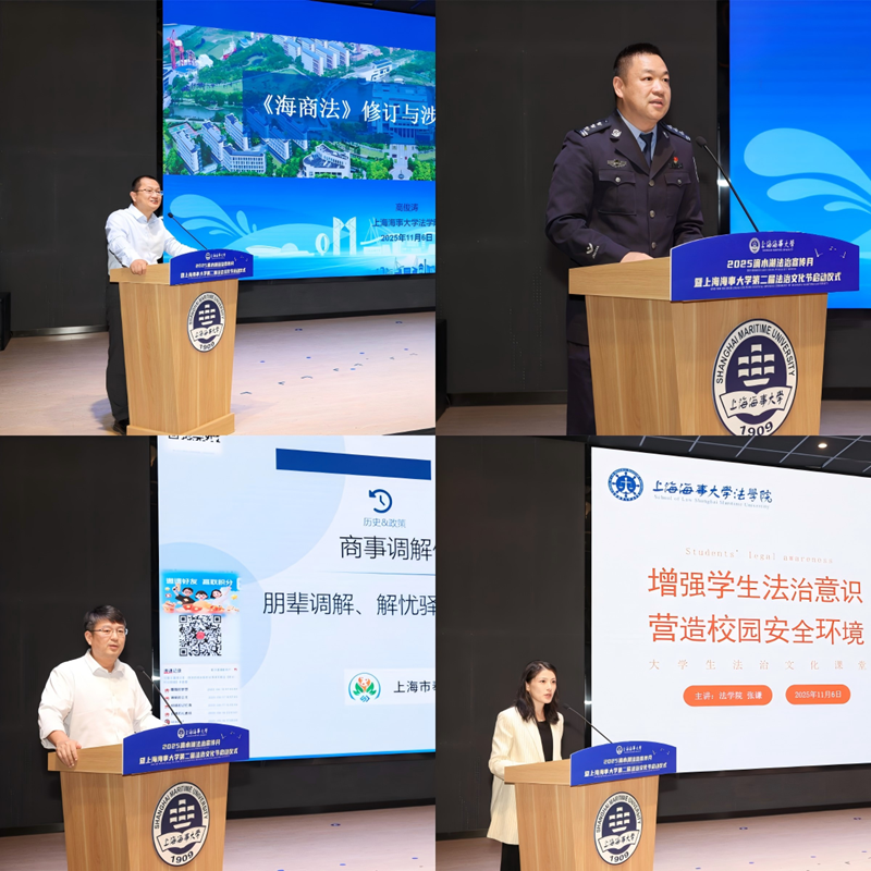 启动仪式后,“法治文化课堂”精彩开讲,现场气氛热烈。法学院副院长高俊涛以“《海商法》修订与涉外海事特别仲裁”为题,深入剖析了最新立法动态与临时仲裁实务,为师生带来国际海事法律前沿的专业指引;临港高校派出所副所长张华结合真实案例,揭秘常见诈骗手法,带来一堂实用又警醒的校园反诈课;奉贤区和正民商事调解中心主任徐玉峰系统讲解民商事调解的流程与技巧,通过“以和为先”化解纠纷;法学院教师张谦则围绕“增强学生法治意识,营造校园安全环境”的主题,结合大学生常见法律问题展开交流,引导学生树立法治观念。