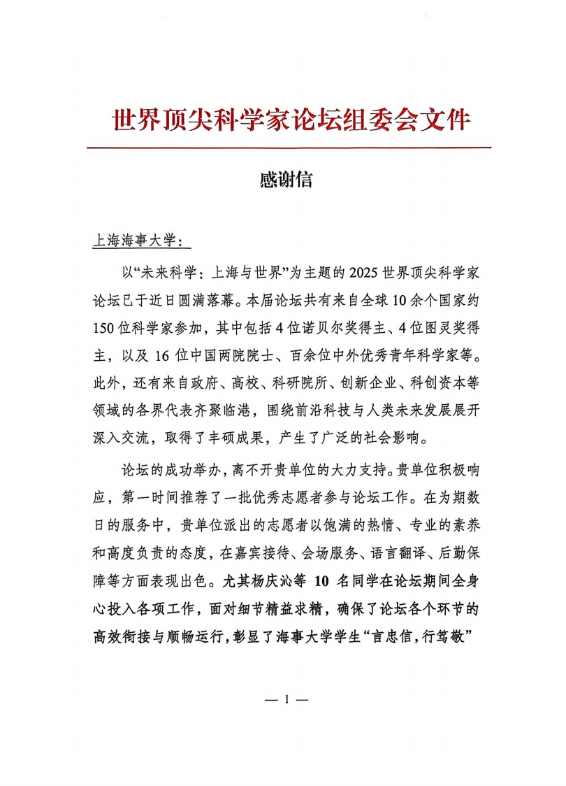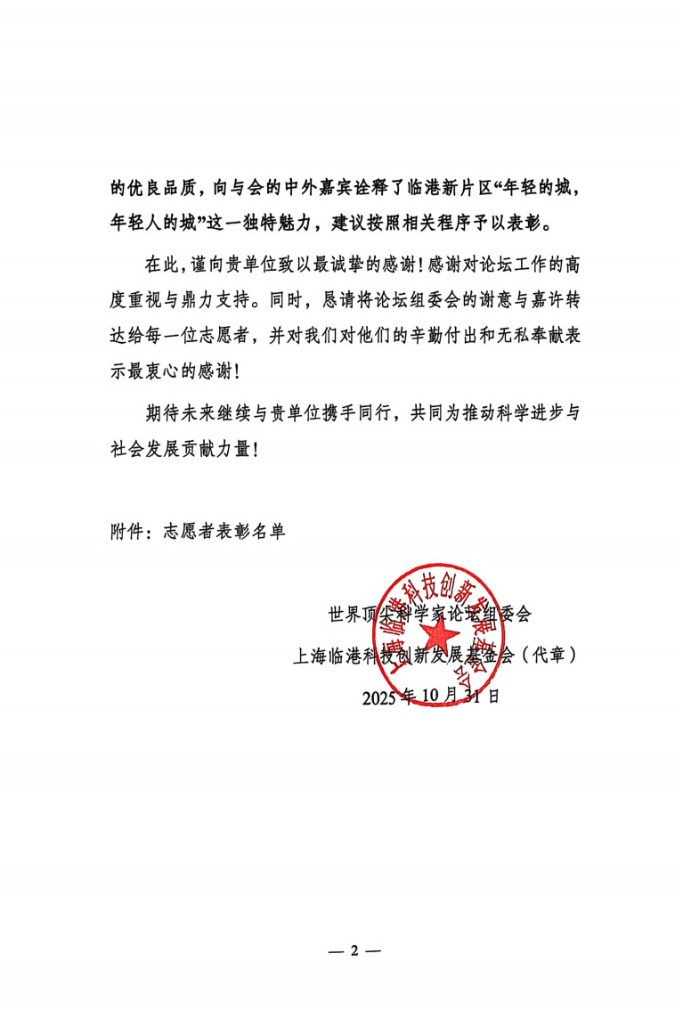 近日,世界顶尖科学家论坛组委会向学校发来感谢信,对学校学生在“2025世界顶尖科学家论坛”中的志愿服务工作表示高度肯定与诚挚感谢。