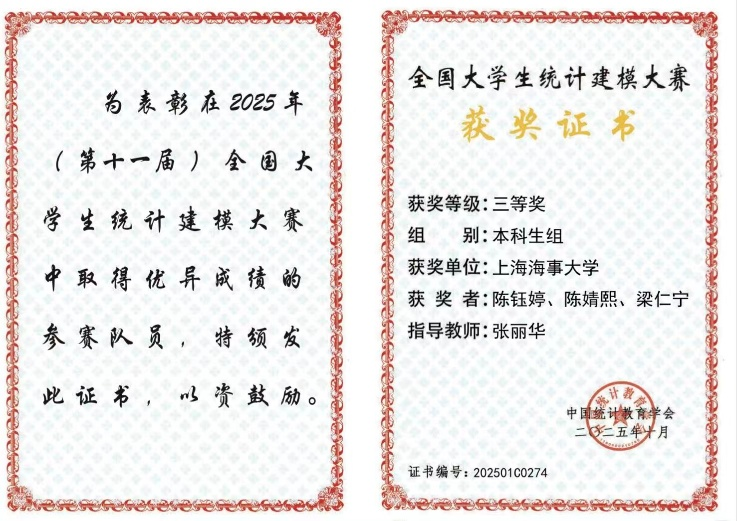 全国大学生统计建模大赛由中国统计教育学会主办,聚焦经济社会热点难点问题,旨在提升大学生数据挖掘、分析及计算机技术应用能力。上海海事大学本科生代表队首次跻身全国领奖台,表现亮眼:共斩获全国三等奖1项,上海市一等奖2项、二等奖4项、三等奖7项,整体获奖比例超30%。其中,学校理学院张丽华老师指导的陈钰婷、陈婧熙、梁仁宁团队,一举拿下本科生组全国三等奖与上海市一等奖,为学校在该赛事中书写下崭新篇章。