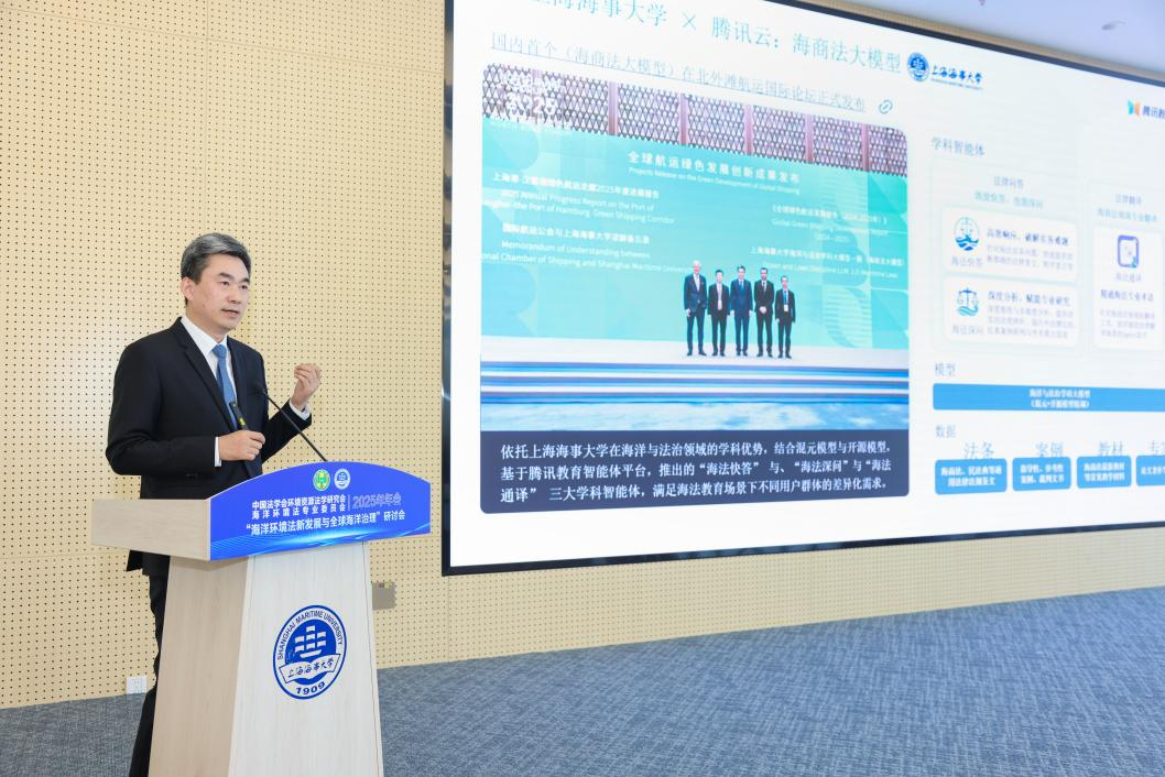 初北平校长在致辞中表示,作为以航运、物流、海洋为办学特色的高校,上海海事大学持续深耕海事法律与海洋环境法治领域,深度参与《海商法》《海洋环境保护法》等重要立法修订工作,在服务国家海洋强国战略和海洋生态文明建设中积极贡献了“海大智慧”。他重点介绍了学校与腾讯云联合研发的全国首个“海洋与法治”学科大模型,展示了人工智能赋能法治研究与人才培养的最新探索,表示学校将以本次会议为契机,进一步推动“法治+科技”深度融合,打造海洋法治创新高地。