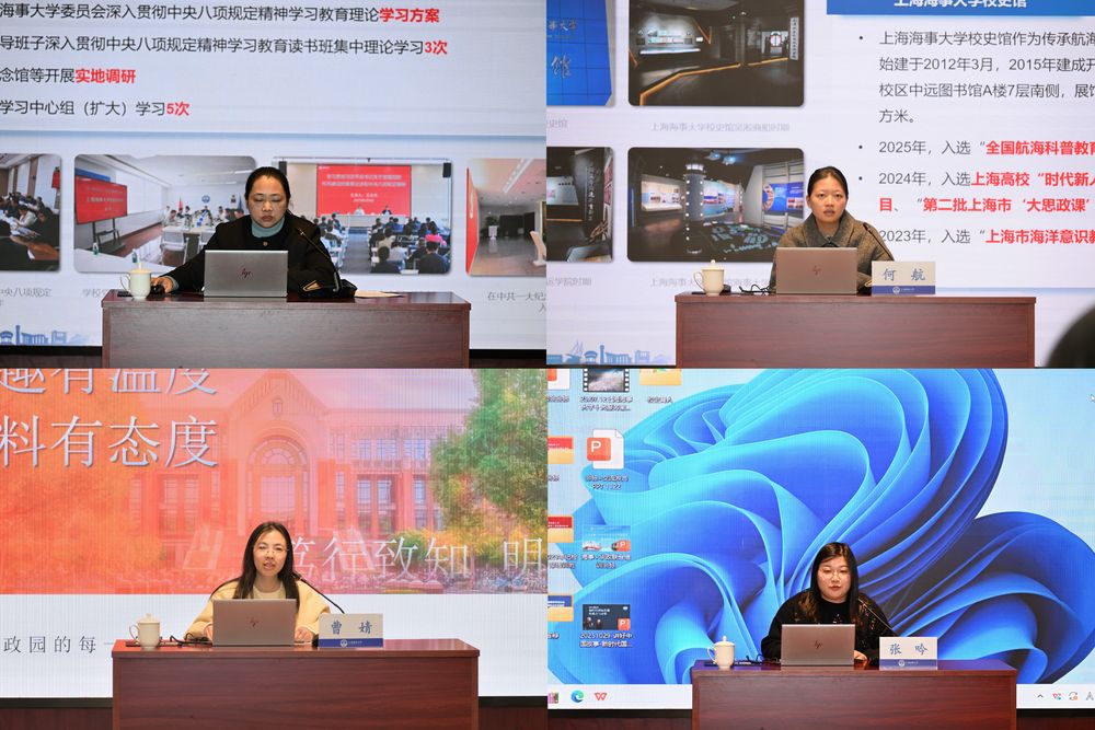 交流研讨环节中,上海海事大学党委宣传部新闻中心焦玉玲老师介绍了学校年度宣传工作情况与成效,校史馆何航老师分享了"AI技术赋能沉浸式校史教育"的创新实践;华东政法大学党委宣传部(新闻中心)网络宣传负责人、校报责编曹婧老师详细介绍了该校宣传工作整体布局、新媒体运营亮点及校报品牌建设经验,后勤管理处办公室主任张吟老师则聚焦后勤系统特色工作,分享了校园服务保障与宣传融合的实践成果。双方围绕新媒体建设、新闻素材挖掘、通讯员队伍培养等核心议题展开交流,延续了两校良好合作传统。