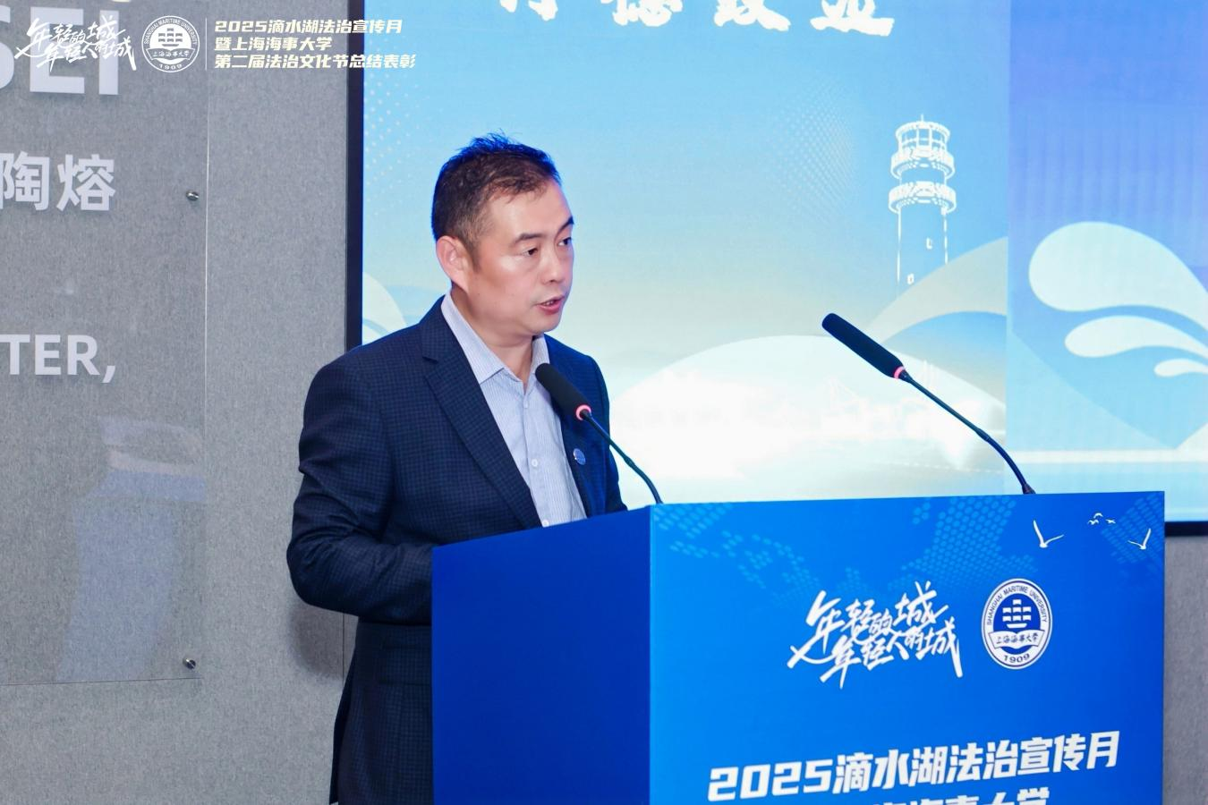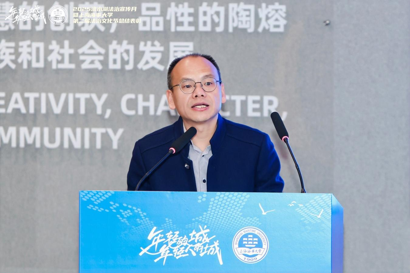 12月9日,由临港新片区管委会、浦东新区司法局与上海海事大学联合主办,上海海事大学法学院、上海科技法律联盟共同承办的“2025滴水湖法治宣传月暨上海海事大学第二届法治文化节”总结表彰大会在临港新片区举行。上海市司法局、浦东新区司法局、临港新片区管委会等单位相关领导,以及驻区法治机构、法律服务机构、法律服务券企业、国际组织及社区代表等共同参与。学校党委副书记、副校长李志鹏出席并致辞。