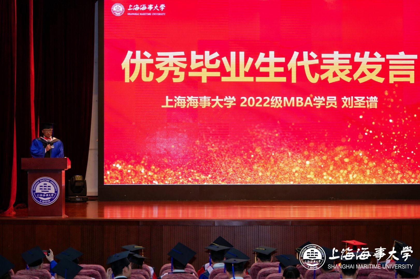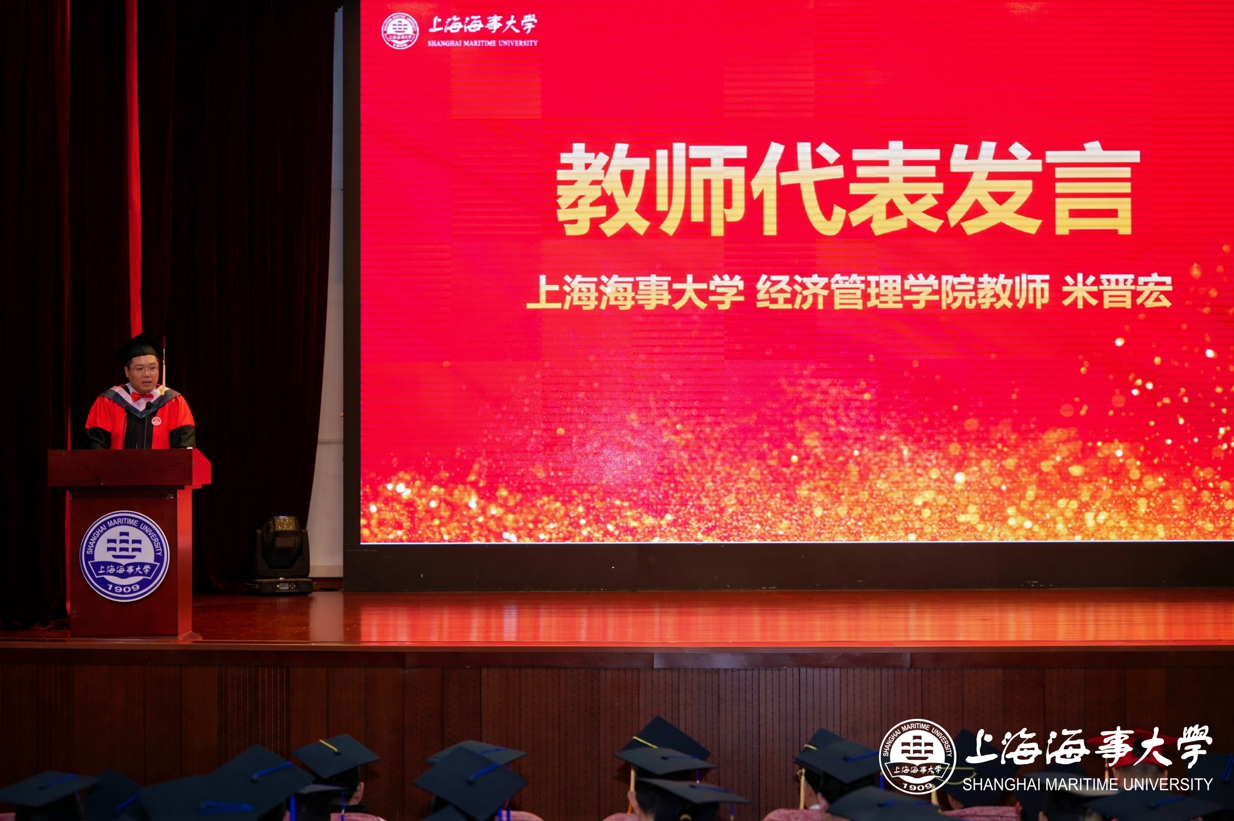 典礼上,学校经济管理学院教师代表米晋宏、优秀毕业生代表刘圣谱分别发言。米晋宏教授表达了对毕业生未来的真切祝福,希望同学们未来以“规模与协同”为桨、以“供需与周期”为锚、以“绿色与数字化”为帆,保持好奇,终身学习,在未来的航道上乘风破浪、满载而归。刘圣谱同学回顾了“忠信笃敬”的校训,表示这是海大人的精神底色,更是港航人的立身之本。他表达了对教授们悉心指引的感恩之情,同时感谢同窗的并肩同行,希望未来与校友们在各自的人生道路上共同展现海大人的责任与担当。