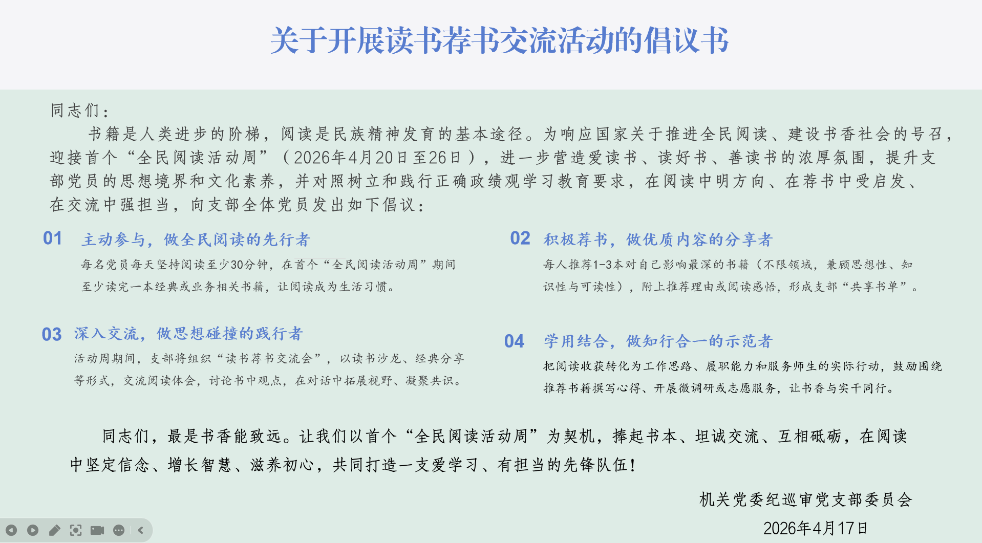 为响应国家关于推进全民阅读、建设书香社会的号召,联学活动向与会党员同步发起“全民阅读活动周”期间读书荐书倡议,并启动“共享书单”第1期交流,促进党员干部在阅读中明方向、在荐书中受启发、在交流中强担当,持续涵养党性、提升能力。